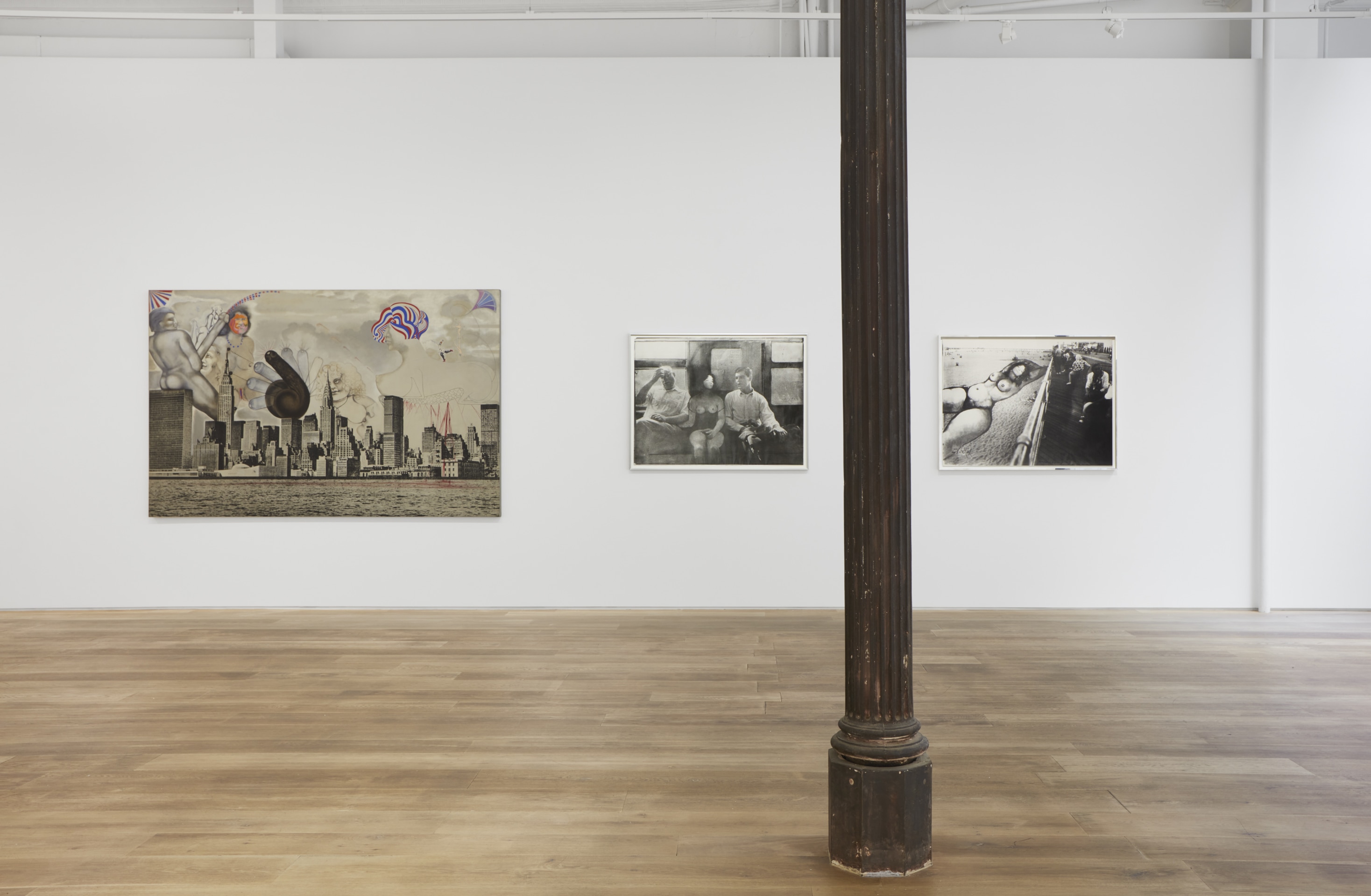 In Giant Women on New York (c. 1969–74), female colossus tower over spaces typically ruled by social decorum. While initially painted, Steckel later adorned these work with her own face in an innovative use of photomontage and self representation. The works vary from bitingly political–such as in Murder by Church Sanctioned Illegal Abortion, in which she is crucified within what appears to be Saint Patrick’s Cathedral–and humorous, such as in another simply titled Subway, in which she sits topless between two men, masturbating herself with one hand and the man to her right with the other. Inspired by her regular exposure to flashers on the subway as a teen, these playful yet divisive works were met with great fanfare when first shown at the Kozmopolitan Gallery in 1969. In her next body of work, the monumental New York Skyline series (1970–80), silkscreened views of the city are overpainted with dancing and distraught bodies, a sphinx, and fluid-spurting penises and breasts, giving form to the vivid libidinal landscape that resides within the visible architectural one.