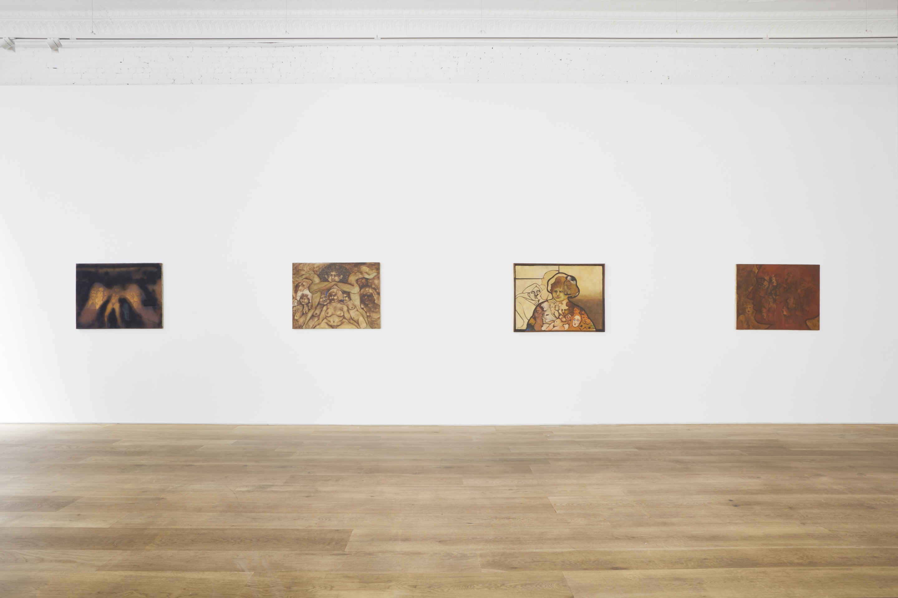 A lifelong New Yorker, much of Steckel’s work reflects on women’s experience of modernity set within the urban landscape. Drawing upon popular culture, politics, and her own biography, Steckel developed her uniquely sardonic voice amongst the thriving downtown scene of the 1950s and 60s in close dialogue with fellow collagists such as Allen Ginsberg, Ray Johnson, Stan VanDerBeek, and Sari Dienes. In an intimate series of works from the 1960s, Steckel explores the division between the public-facing roles women were expected to perform and the rich complexity of their interior lives. In The Big Rip-Up (1964) she overpaints a black-and-white photograph of herself as a teenager, her youthful yet deliberate gaze out towards the viewer subsumed by a copulating crowd of nude bodies and contorted faces rendered in graphite, her right eye bloodshot and crying a technicolor stream of tears. In a series of works on paper, which were included in her first solo exhibition in 1961, she creates Rorschach tests by folding papers blotted with brown ink, out of which she draws ghoulish expressions. In oil paintings made in the second half of the decade, outlines of women’s profiles are filled with kaleidoscopic arrays of nude forms, whose bodies swirl across the canvas like thoughts going through one's head. Appearing both claustrophobic and anxious, sensuous and seemingly carefree, Steckel’s women give form to the tension between the only burgeoning women’s liberation movement and the still pervasive constraints of patriarchy.