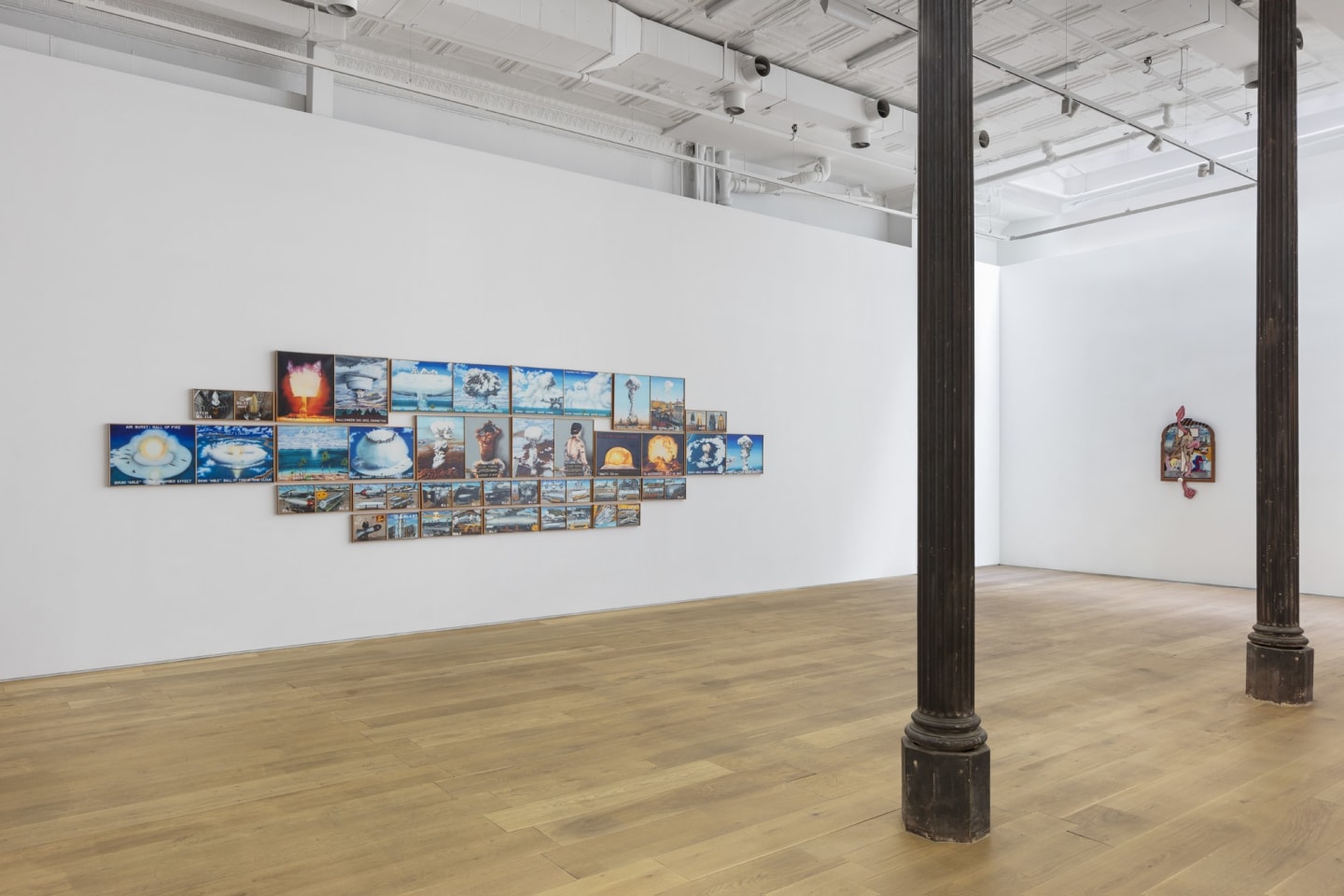 The exhibition also features works from Bombs, 1983, a series comprised of mostly single-panel diptych airbrush paintings, made over four months during a period of tense political escalation in the Cold War. Drawing on imagery produced by scientific and clinical researchers for the U.S. military, the “hard-edge” realism is a searing indictment of nuclear armament—a condemnation shared by his colleague and friend Vija Celmins. The more recent suite of 15 panels, Towers, 2014, renders the surveillance systems and austere structures of the camps where Japanese residents and US citizens were incarcerated during World War II. Sakoguchi has remembered his time interned in Poston, Arizona, as a place of “mostly browns and grays.”