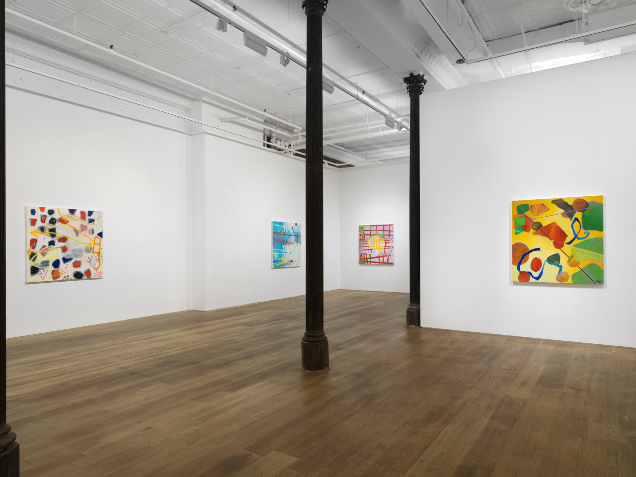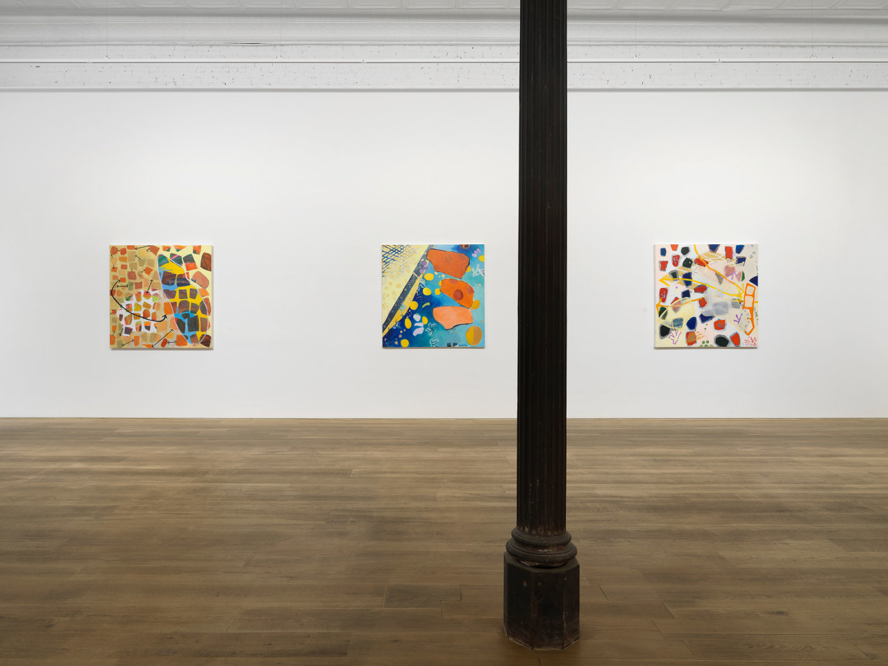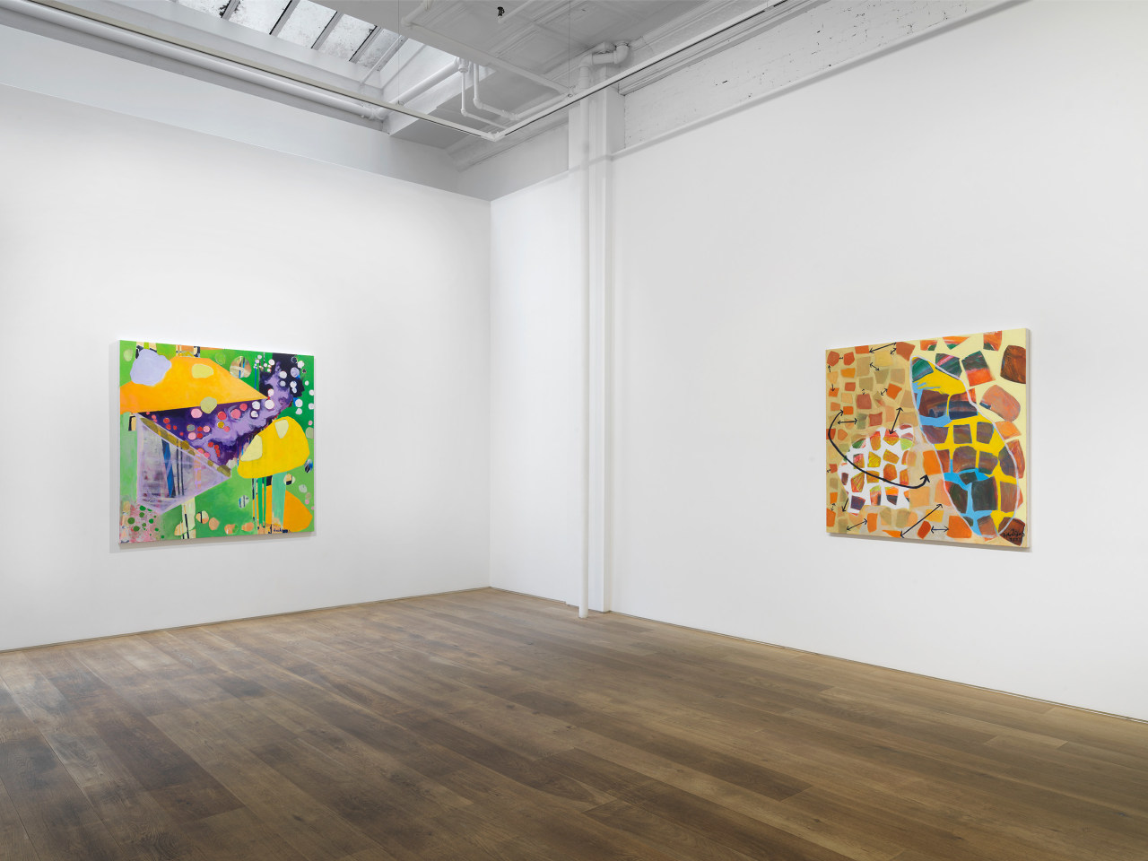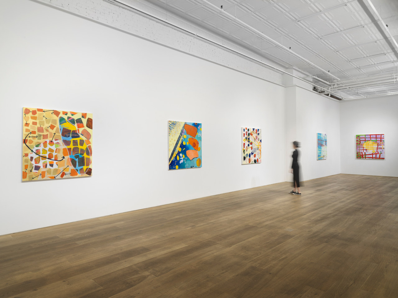 Through her ten new paintings, Hawkins has developed an improvisational process in which free-floating symbols, shapes, and fields of color are layered to occlude and veil each other in fractured planes. Appearing at once cellular and interstellar, the canvases seem to contain multiple compositions simultaneously, with varying spatial systems and color schemes that shift in and out of focus. The inspiration for her series has more banal origins, however: a photograph of tomato soup that a friend shared on social media. The interplay of overlapping beads of oil on broth, reflected light, and vividly saturated color initially appeared otherworldly to the artist, as the image was closely cropped enough for the soup to fill the entirety of the digital square. Amused and inspired by the reality of the images’ subject and the complexity of its composition, Hawkins has riffed upon its internal visual relationships in a continuation of her longstanding investigation of abstraction.