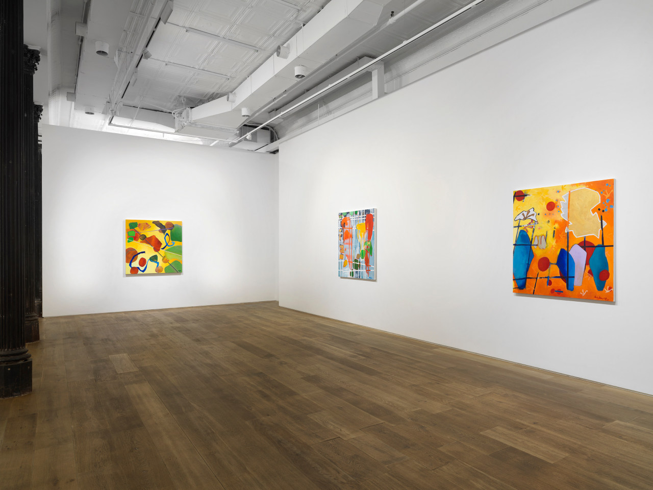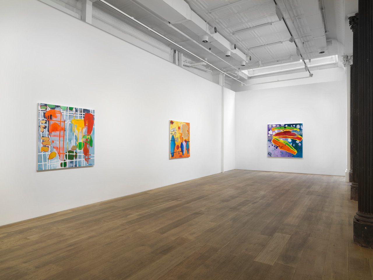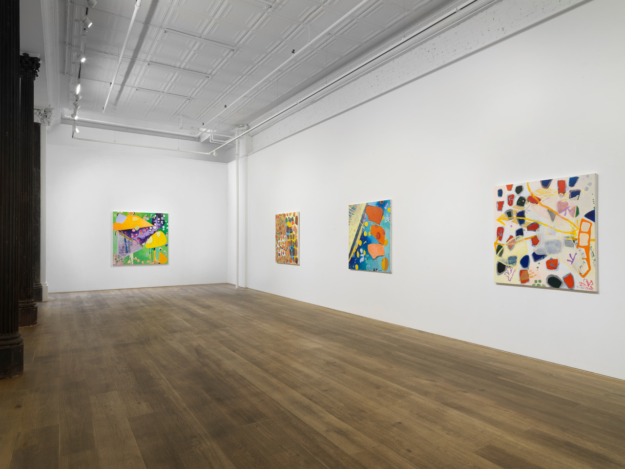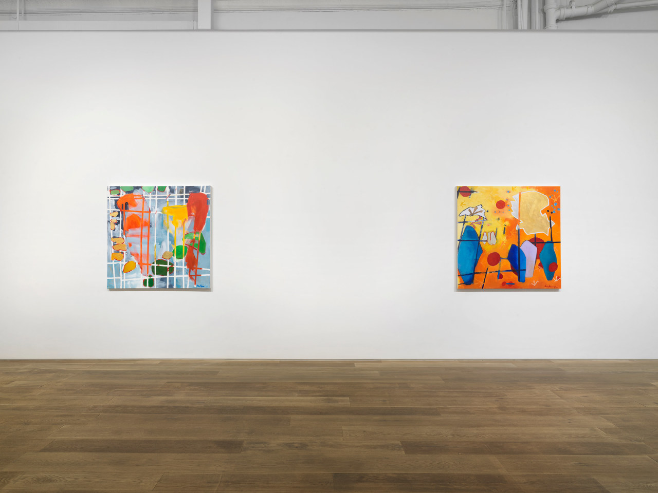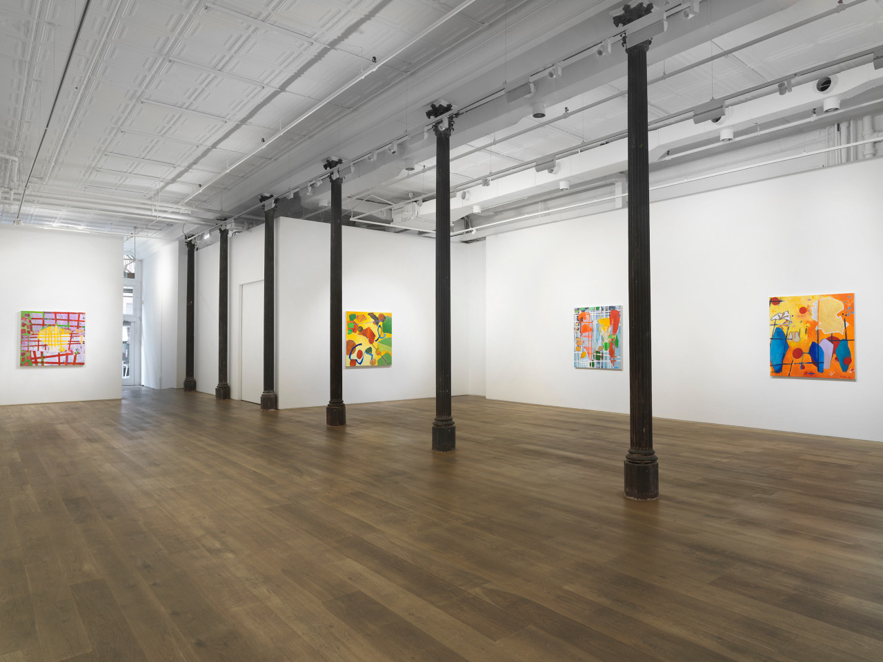 Through her ten new paintings, Hawkins has developed an improvisational process in which free-floating symbols, shapes, and fields of color are layered to occlude and veil each other in fractured planes. Appearing at once cellular and interstellar, the canvases seem to contain multiple compositions simultaneously, with varying spatial systems and color schemes that shift in and out of focus. The inspiration for her series has more banal origins, however: a photograph of tomato soup that a friend shared on social media. The interplay of overlapping beads of oil on broth, reflected light, and vividly saturated color initially appeared otherworldly to the artist, as the image was closely cropped enough for the soup to fill the entirety of the digital square. Amused and inspired by the reality of the images’ subject and the complexity of its composition, Hawkins has riffed upon its internal visual relationships in a continuation of her longstanding investigation of abstraction.