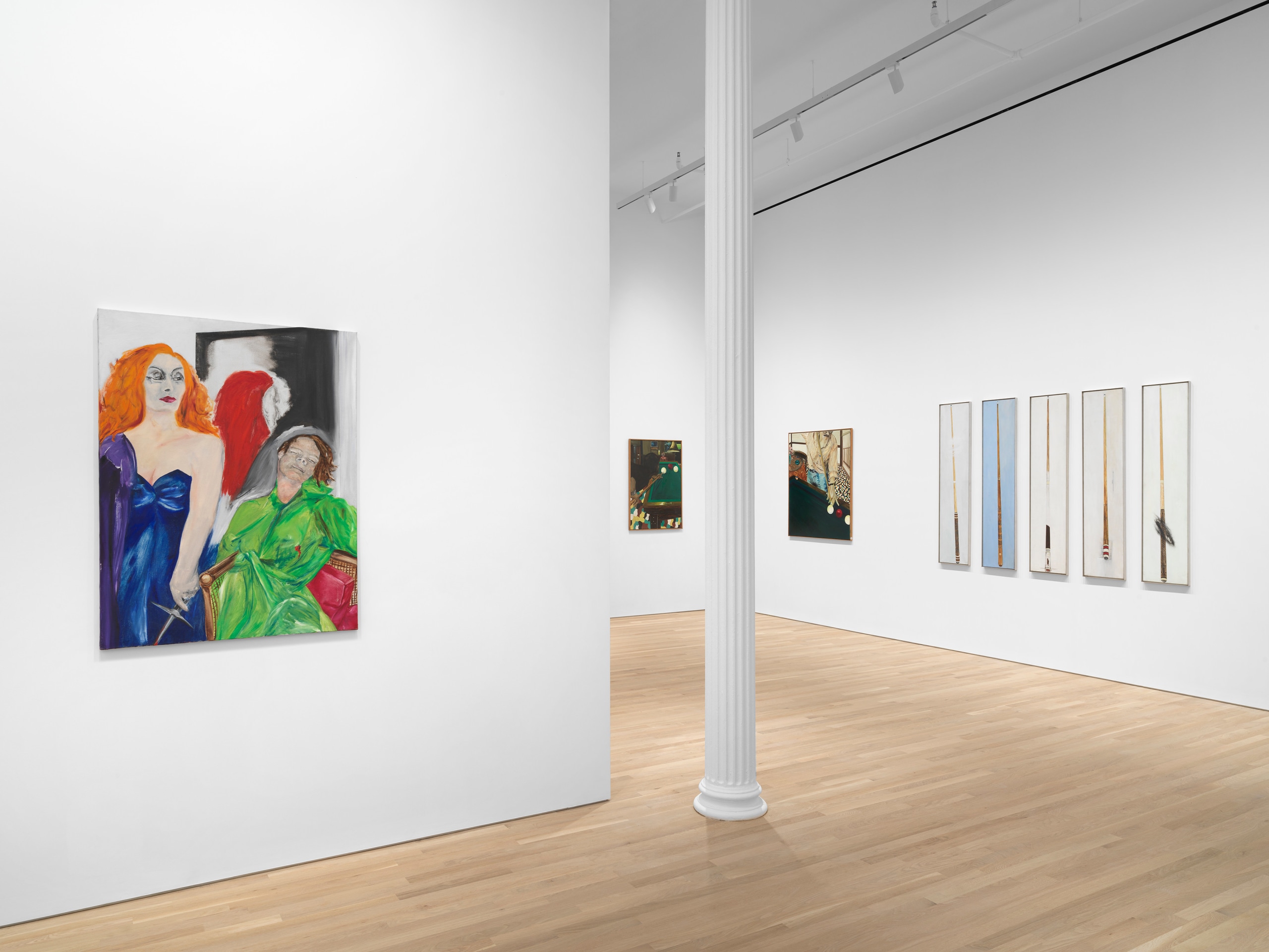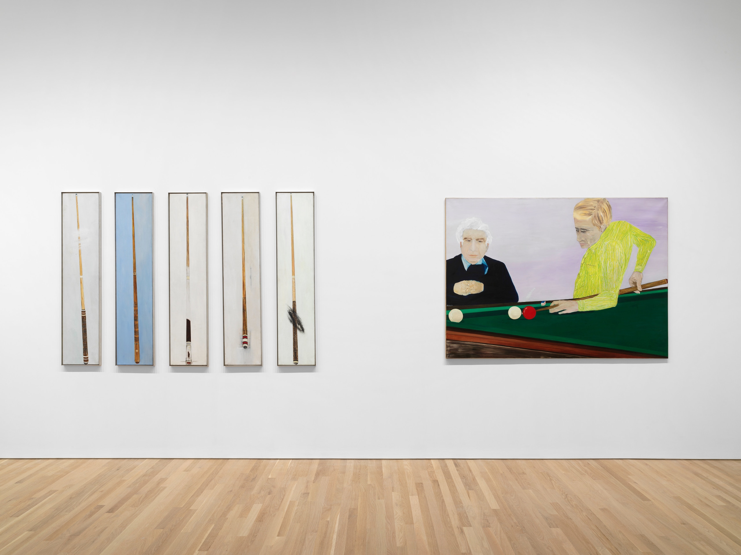 In her Billiards series, de Jong paints sleek, Pop-inspired scenes of pool games, in which players contort their bodies in close proximity. At once unassuming portraits of ordinary life, the paintings are also loaded with visual puns and double valances. Where slanted tables and fields of felted green baize serve as reminders of the picture plane, glossy balls and long tapered sticks exude erotic suggestion. In Crispy Hands (Mains crispés) (1977), a man dressed in a loud, lime green button-down leans backward over the pool table, while a well-suited older gentleman eyes the shot with hands clasped in nervous anticipation. As the artist pokes fun at the inherent drama and violence of an activity centered around male competition, the billiard table emerges as a metaphorical site for larger social tensions to play out. In de Jong’s words, “as in War, [games] are played to be WON.” In many ways, continuing themes explored in the final, unfinished “Pinball Issue” of The Situationist Times––a journal edited by de Jong for which she became widely known––the notion of the game also becomes an allegory for artistic production and the common conception at the time of Modernism as having entered its endgame. Meanwhile, the five-part painting titled Queue (III, V, II, IV, I) (1978) portrays queues (originally called “maces”) against monochrome backdrops, dislocating the objects from any discernible time and space. Referencing the slang term for penis in French, the title lampoons the often-chauvinistic jockeying that defines art history, while underscoring the significance of language as a material in this unexpectedly conceptual series.