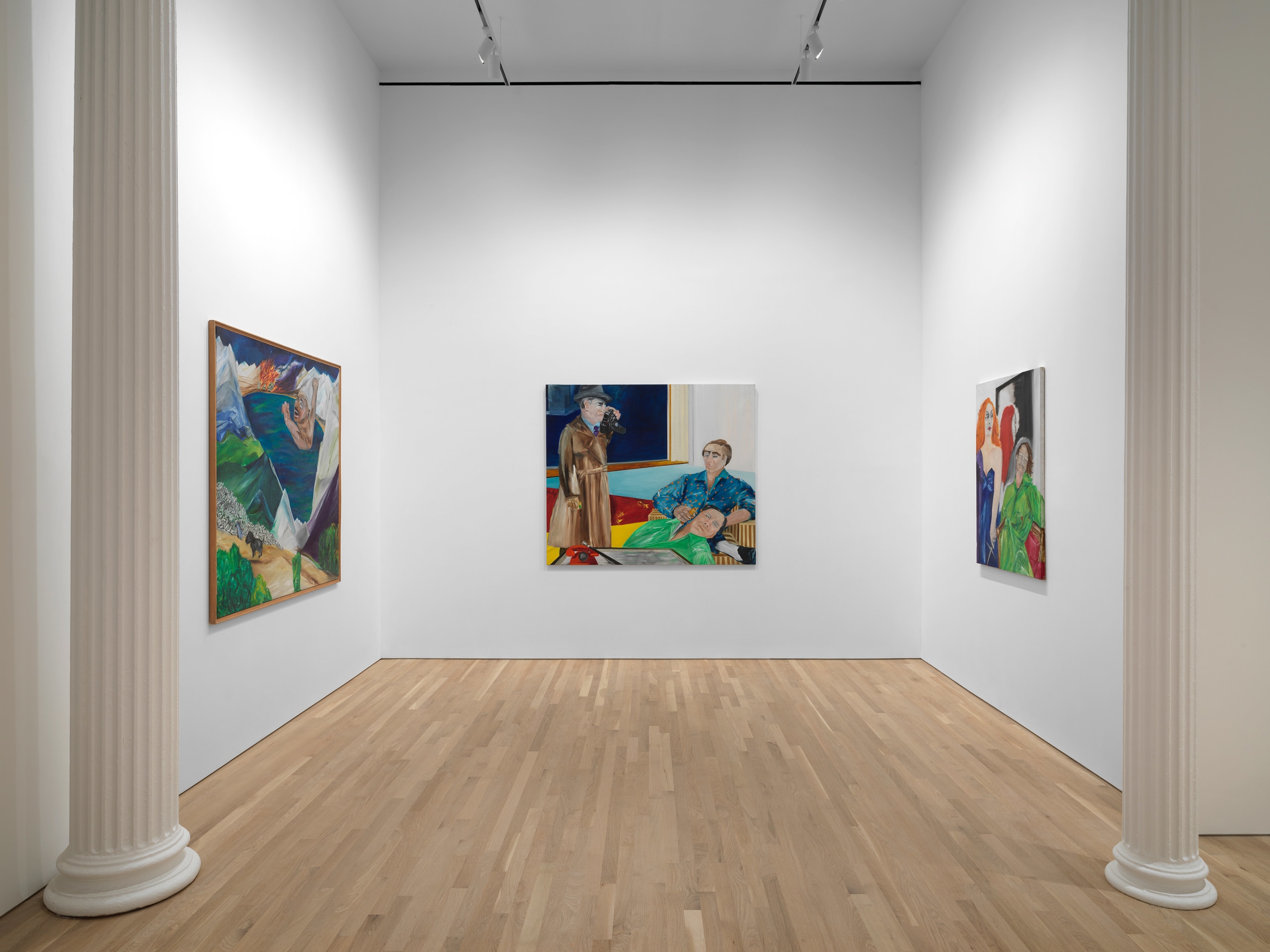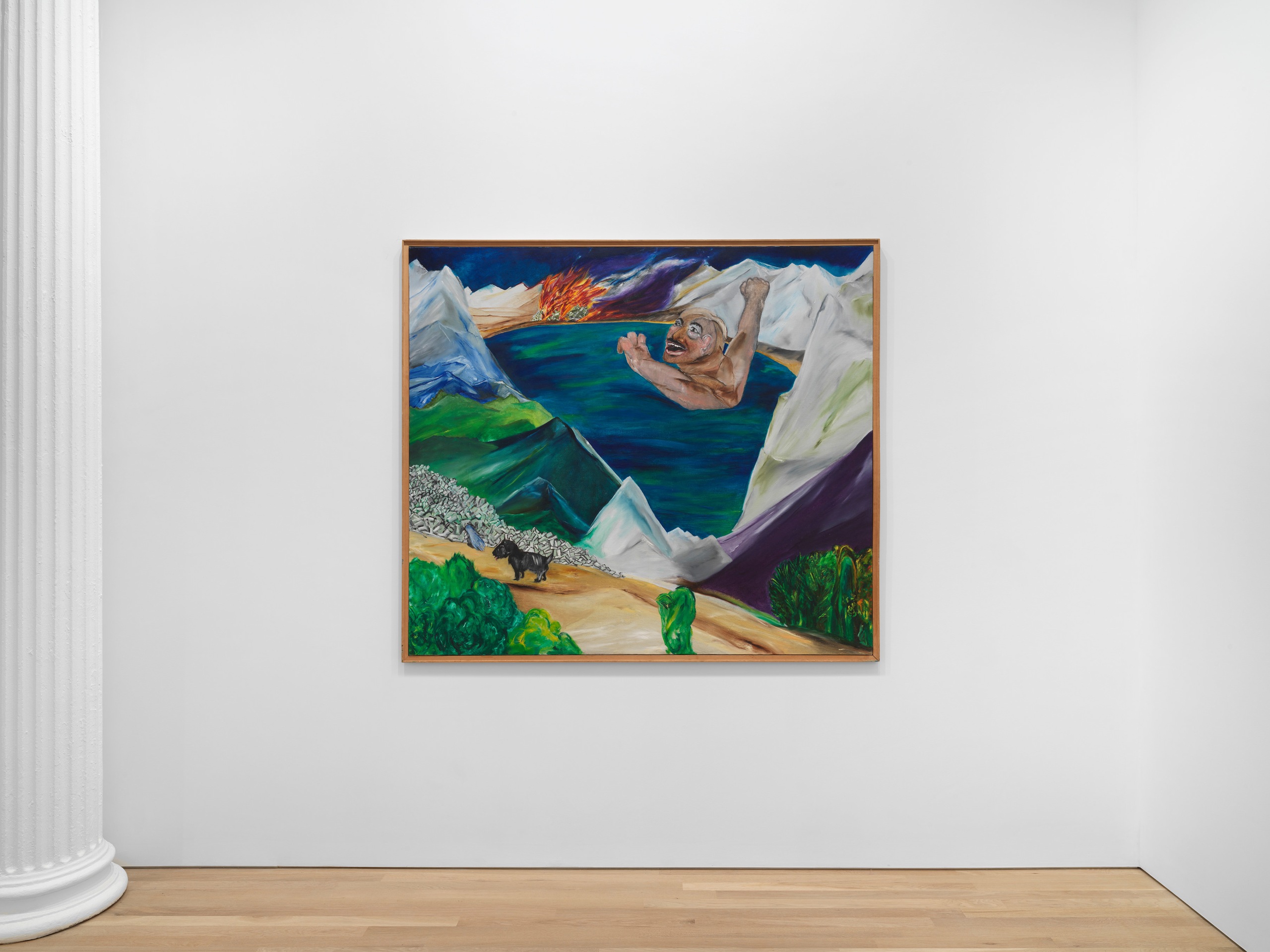Série Noire draws inspiration from Marcel Duhamel’s postwar publishing imprint of detective novels, locating de Jong’s paintings within the genre of pulp fiction. Through dislocating scenes from their storylines, de Jong recasts moments of impassioned violence as emblems of the human experience in all its complexity. In L'Âne du Liban (1981), based on the Anglo-Lebanese author Edward Atiyah’s book of the same name (translated as Donkey from the Mountains, or later The Cruel Fire), de Jong depicts the protagonist as a colossus. The sense of shame and guilt that instigates and follows his debaucherous murder spree is realized in his monstrous form. In Gardez-vous à gauche (1981), again titled after a political parable by Paul Sérant (translated literally as Keep to the Left!), de Jong portrays a hard-boiled detective arriving just before the scene of a crime. Witnessing the stabbing-in-action, the figure disregards any sense of social responsibility to intervene, parodying the author’s treatise that, with the rise of the left, the young bourgeoisie had lost its prewar tendency to nationalism or fascism and now wallows in feelings of absurdity or uselessness. De Jong uses the pulp novels as vehicles to explore her larger themes of eroticism, humor, war, and cruelty, parodying history as a long series of tragic events, doomed to repeat themselves ad infinitum.