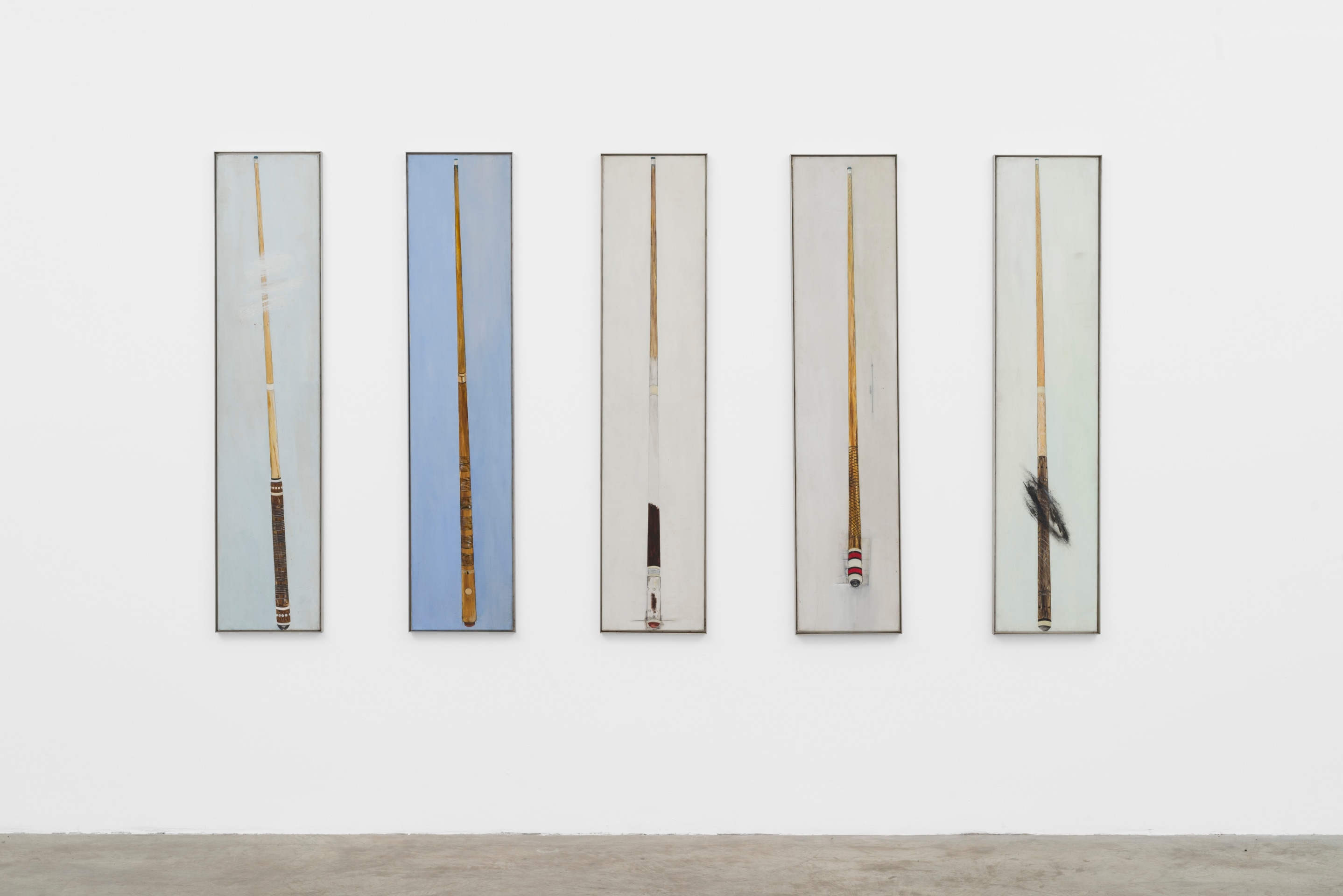 In her Billiards series, de Jong paints sleek, Pop-inspired scenes of pool games, in which players contort their bodies in close proximity. At once unassuming portraits of ordinary life, the paintings are also loaded with visual puns and double valances. Where slanted tables and fields of felted green baize serve as reminders of the picture plane, glossy balls and long tapered sticks exude erotic suggestion. In Crispy Hands (Mains crispés) (1977), a man dressed in a loud, lime green button-down leans backward over the pool table, while a well-suited older gentleman eyes the shot with hands clasped in nervous anticipation. As the artist pokes fun at the inherent drama and violence of an activity centered around male competition, the billiard table emerges as a metaphorical site for larger social tensions to play out. In de Jong’s words, “as in War, [games] are played to be WON.” In many ways, continuing themes explored in the final, unfinished “Pinball Issue” of The Situationist Times––a journal edited by de Jong for which she became widely known––the notion of the game also becomes an allegory for artistic production and the common conception at the time of Modernism as having entered its endgame. Meanwhile, the five-part painting titled Queue (III, V, II, IV, I) (1978) portrays queues (originally called “maces”) against monochrome backdrops, dislocating the objects from any discernible time and space. Referencing the slang term for penis in French, the title lampoons the often-chauvinistic jockeying that defines art history, while underscoring the significance of language as a material in this unexpectedly conceptual series.