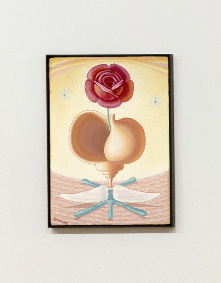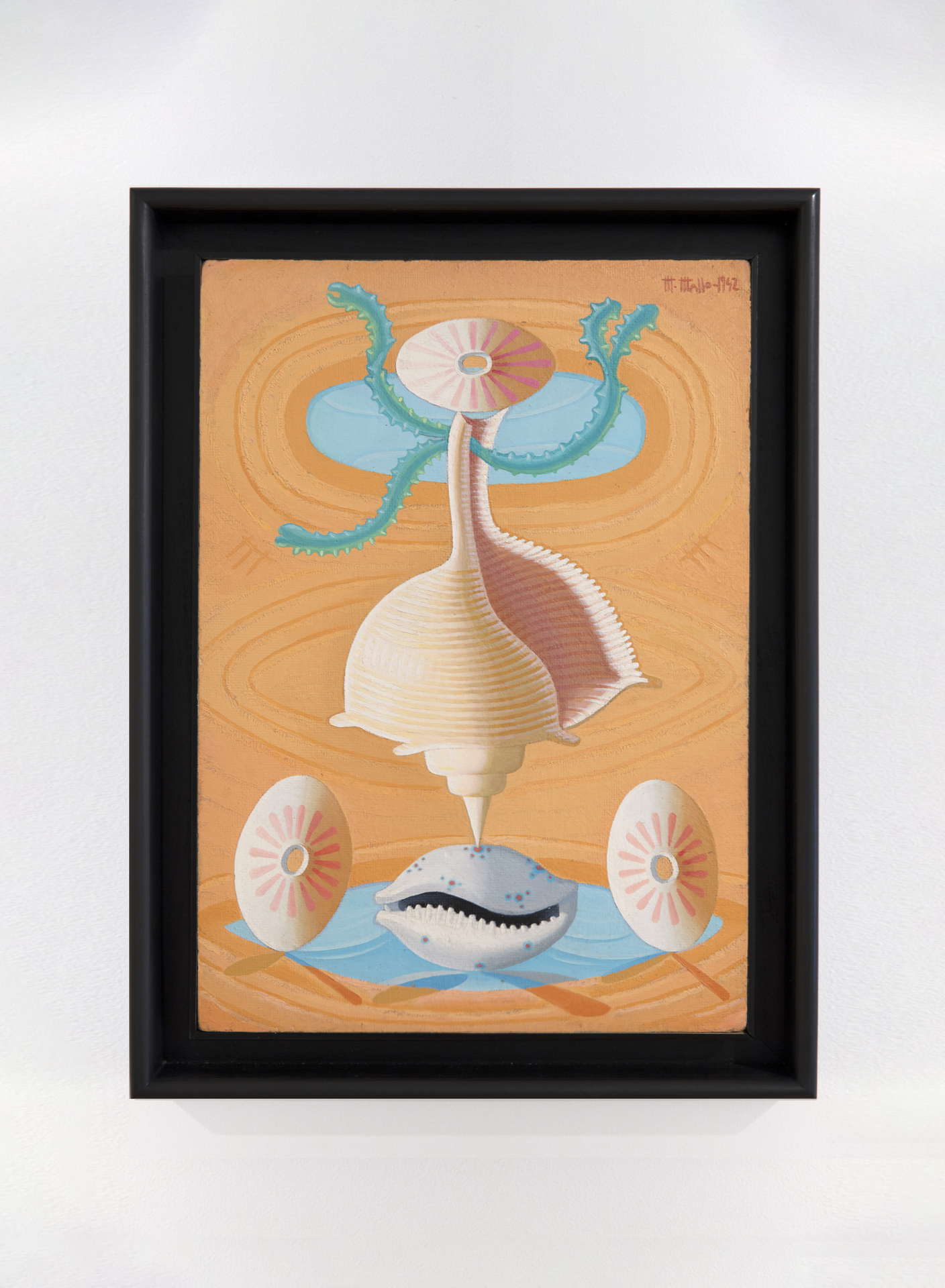 Mallo, like her contemporaries, was politically engaged in both art and life. In 1936, with the outbreak of the Spanish Civil War, Mallo went in exile to Buenos Aires. Encountering diverse and newly discovered urban and natural environments, Mallo’s work of this period is characterized by a newfound vibrancy and sensuality. Her Naturalezas Vivas depict marine and floral motifs in eroticized configurations. Mallo’s interest in the oceanic can also be seen in a series of 1945 photographs taken with Pablo Neruda (himself an avid collector of shells), in which Mallo appears as if having emerged from the sea. The Naturalezas Vivas formed the core of Mallo’s previous New York exhibition, which took place in 1948 at the Carroll Carstairs Gallery.