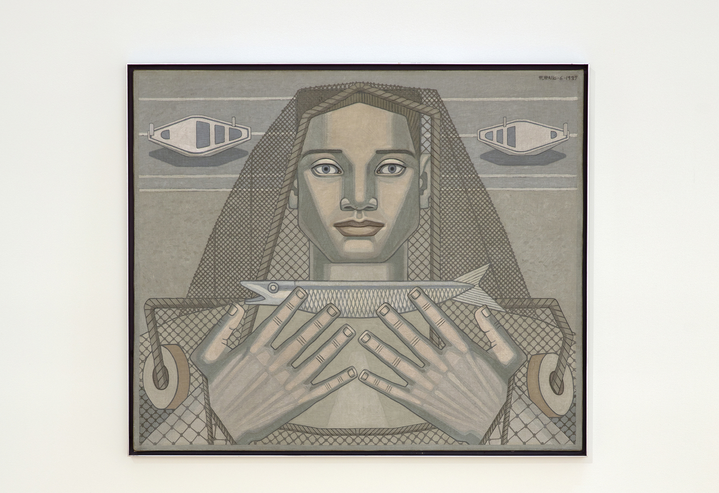After meeting the Uruguayan painter and theorist Joaquín Torres-Garcia in 1933, Mallo’s surrealism merged with an intensified interest in mathematics, structure and abstraction. This stylistic shift—through which she remained committed to local observation—is exemplified by an increasing interest in compositional clarity and the symmetrical distribution of forms (a mode that the art historian Estrella de Diego describes as “intellectual”). Some of her most canonical works, such as Arquitectura Humana / El Pescador (1937) and La Red (1939), emerged in dialogue with Torres-Garcia’s advanced theorization of painterly construction.