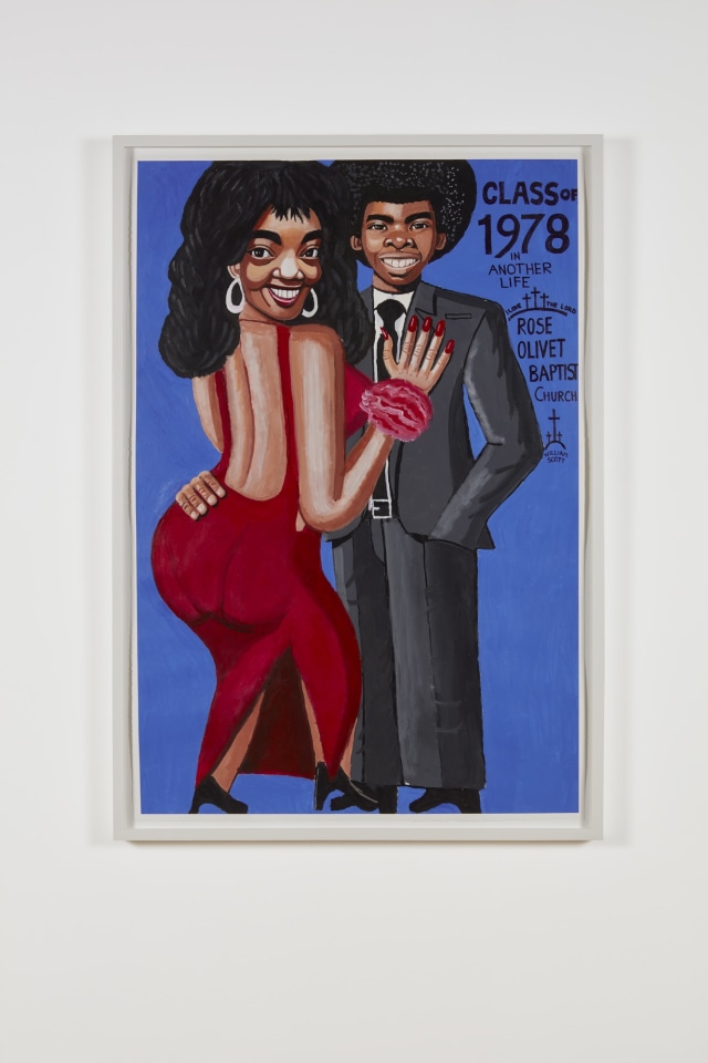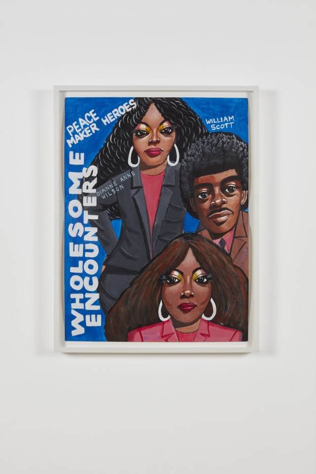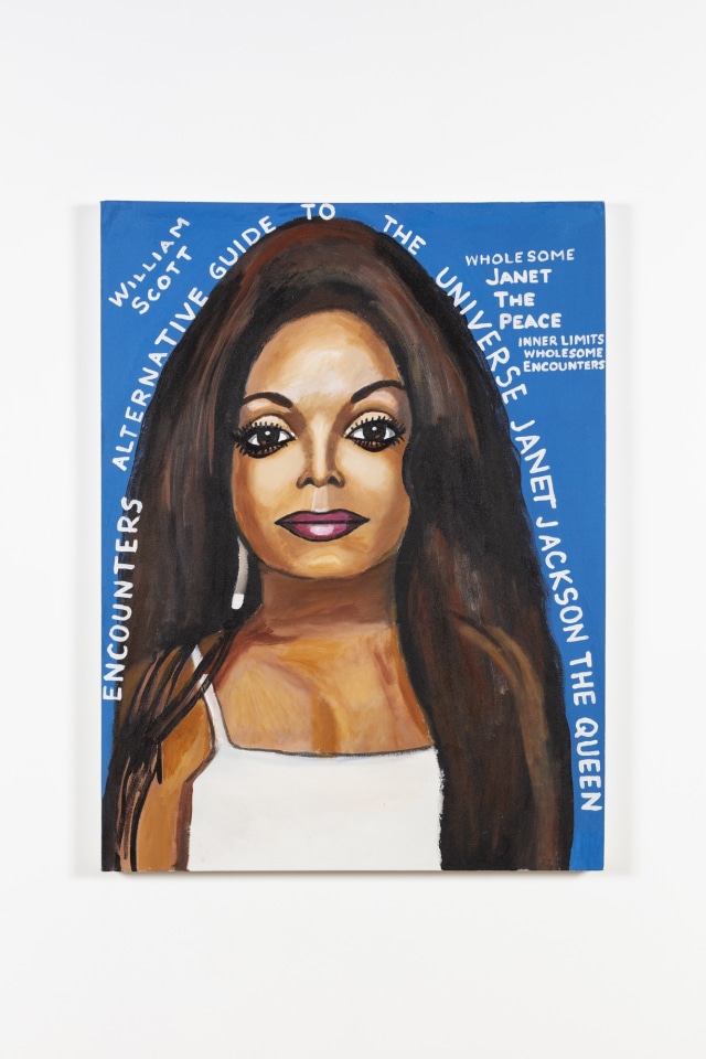 For the series “Another Life,” Scott’s brightly tinted figurative compositions instead skew retroactively, fantastically re-inscribing hairstyles, hoop dreams, Valentines and prom dates that could have been. The exaltation of Black women here also recurs in a series of dancing church ladies, and another of sensitive portraits of icons like Janet Jackson and Angela Bassett—voluptuous figures rendered with a reverence equaling that of Zap Comix’s R. Crumb. Meanwhile, the thread of transformation explored in the self-portraits of “Another Life” is taken up by the group of painted papier-mâché masks on view, which at first appear to be pop sculptural busts. A mask is activated when the artist uses it to assume another identity, and also to destabilize the perceived monstrosity of the character portrayed. This drama unfurls tenderly, via Darth Vader, in the video-performance Beautiful Peace on Earth, 2013, from which the title of this exhibition arises.