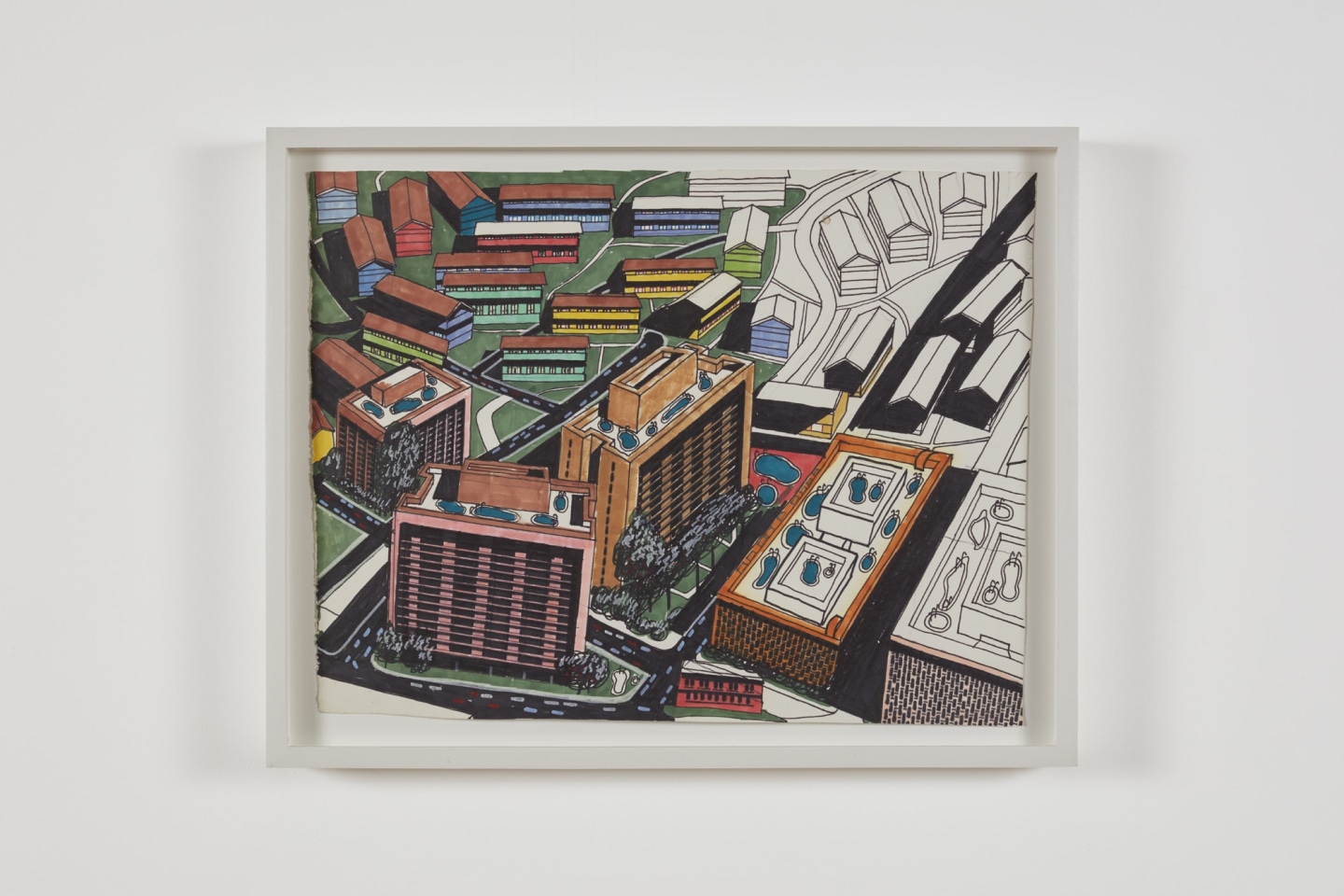 A self-taught artist from the Bay Area, Scott creates work that imagines alternative realities grounded in a deep belief in the potential for positive human transformation. Already an acute draftsman and careful observer of the urban environment by the 1970s, Scott’s earliest body of mature work includes intricate perspectives of the dense color, shape, and forms of his native city, a gridded peninsula of modern skyscrapers buffeted by the Pacific Ocean and the San Francisco Bay. The smooth passage of Municipal Transport Agency (MUNI) buses along the city’s steeply graded streets inspired the artist as a kind of spectral transportation, manifest in the “Wholesome Encounters” paintings of groovy space shuttles—glowing in silver, lime, and chartreuse—peopled by fresh-faced yet perpetually time-traveling passengers and crew, from Curtis Johnson to Diana Ross. If space is the place, how we get there also matters. Scott’s intergalactic flights, chartered by the “Skyline Friendly Organization,” bring specifically diverse, dead, and living figures together into a shared time-perspective—one possible future—that reveals the exceptionality of such multicultural and intergenerational assemblies today.