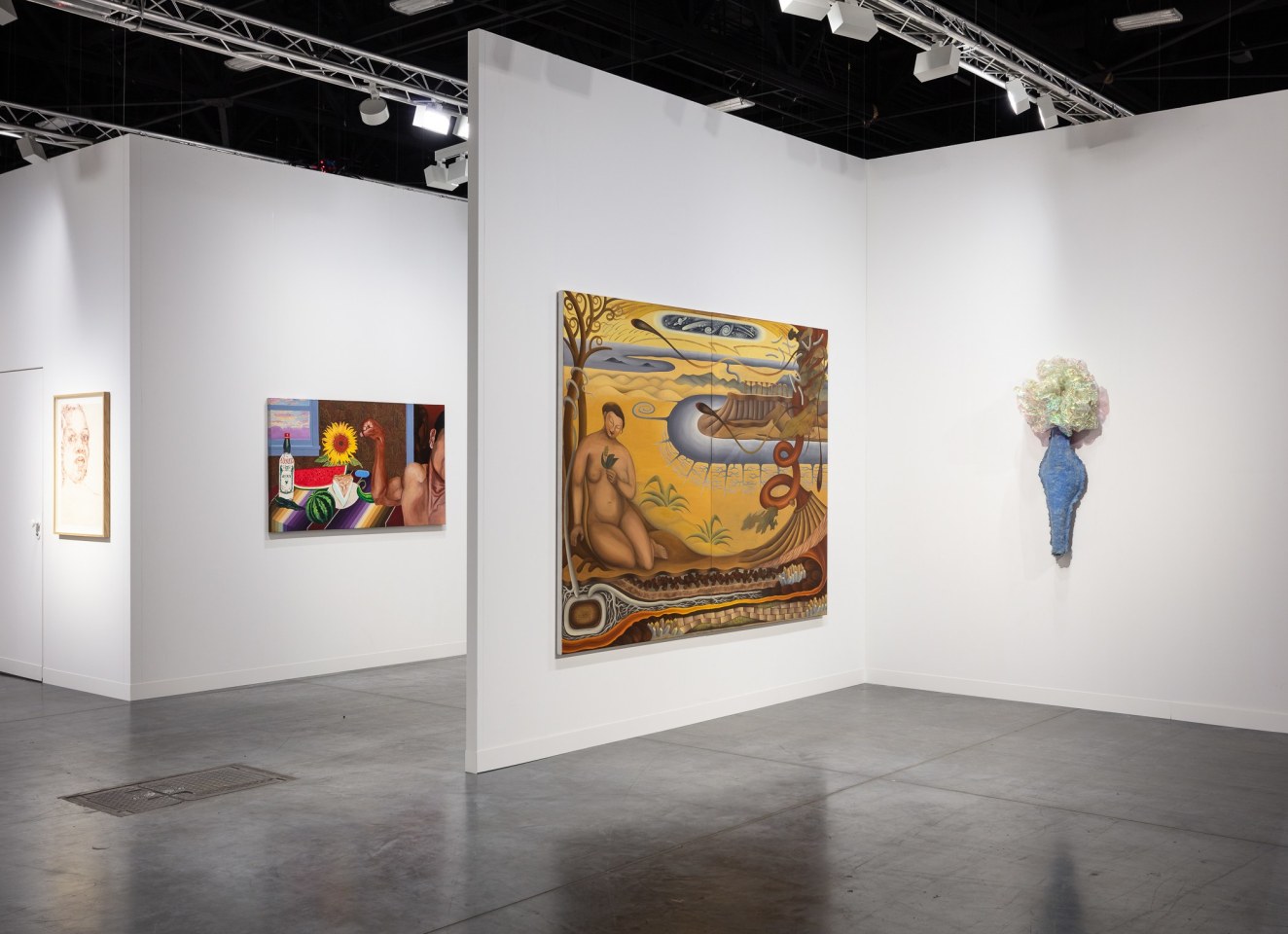 Representations of overlooked and misunderstood subjects are the focus of figurative painters on the booth. The elongated, sinuous figures in Barnes’ paintings take inspiration from the Italian Mannerists to depict scenes of Black joy. Slam Before the Storm presents the quotidian scene of young, barefoot men playing basketball with a makeshift hoop in transcendent terms. A former NFL player, Barnes demonstrated a keen sensitivity to the nuanced representations of Black athleticism and movement. His Juba Dis an Juba Dat (1976)—which references the West African repercussive dance adopted by Black slaves in the Antebellum South—highlights the artist’s capacity to recreate movement and soul. Grasping disposition, personality, and mood, Johnson’s compositions in pastel and oil-stick confront the distortions and erasures that obfuscate the Black figure in Western art history. The interplay of positive and negative space in Self Study (2022) fosters a sense of incompleteness, which recreates the feeling of the evolving process in an artist’s studio. Joey Terrill’s A Bigger Piece (2008) is from the artist’s series of still lifes which he began in 1997 as a strategy to queer and, in his words, “Mexicanize” the genre. The products Terrill incorporates are symbolic of both American and Latino consumerism; the table is lined with a colorful sarape blanket, a stark revisioning of the classic American checkerboard. The enlarged blue Truvada pill, for years part of the artist’s daily HIV treatment, is now commonly used as a “preexposure prophylaxis” (PrEP) drug, a testament to the evolving nature of HIV care. With Innate Behavior (1990) Yamaguchi illustrates a recumbent female figure merging with the earth in a style reminiscent of Diego Rivera. By modeling and revisioning nudes à la Rivera, Yamaguchi challenges assumptions of what is expected of a Japanese artist, playing with her adopted home of Southern California and the cultural hybridity of her artistic identity.