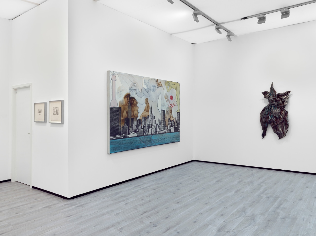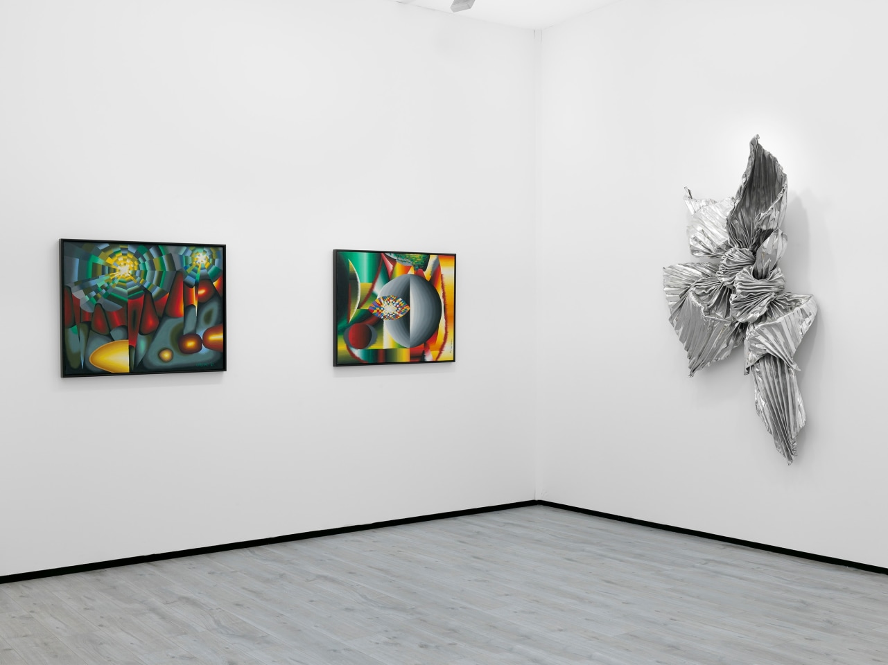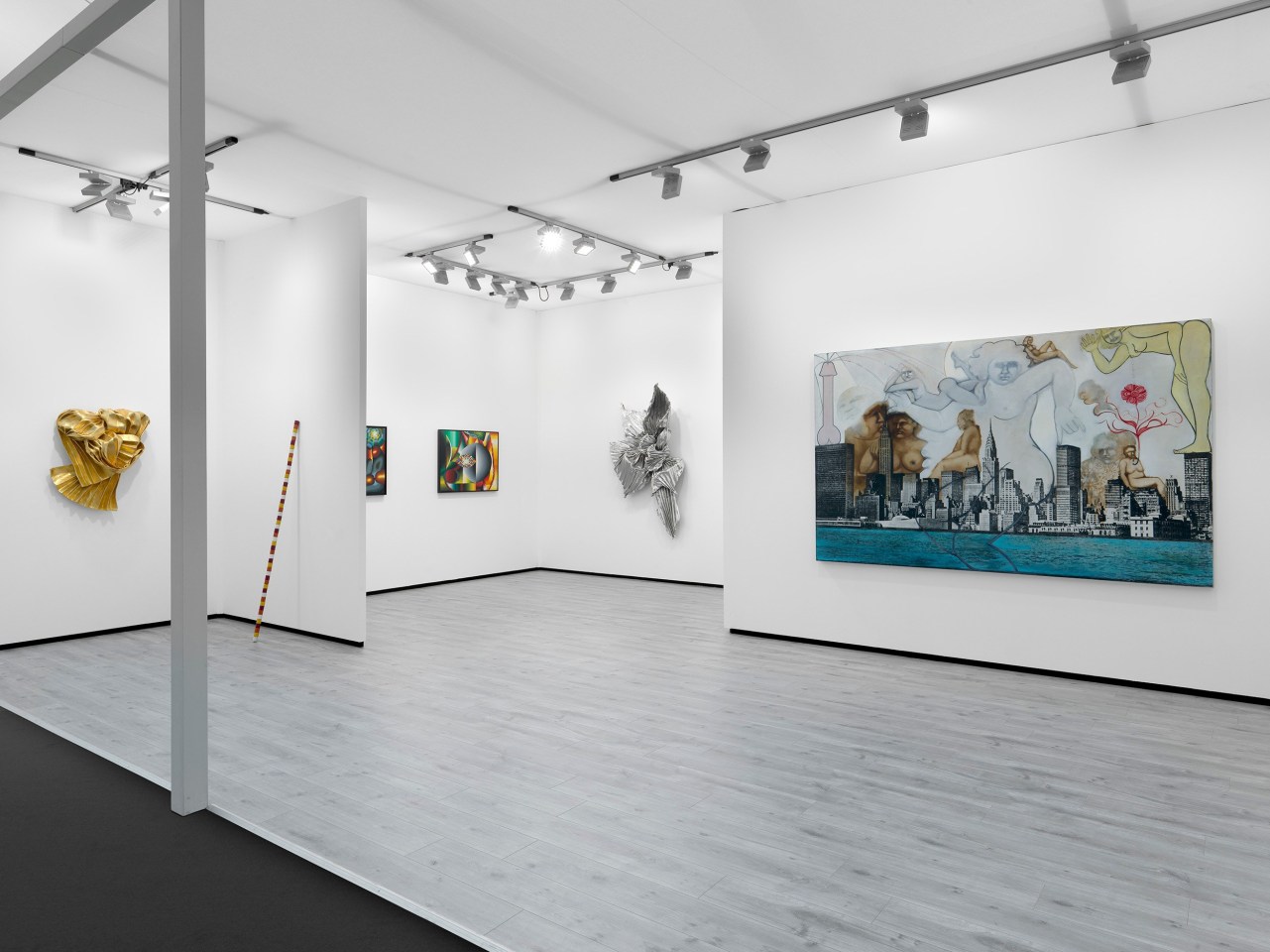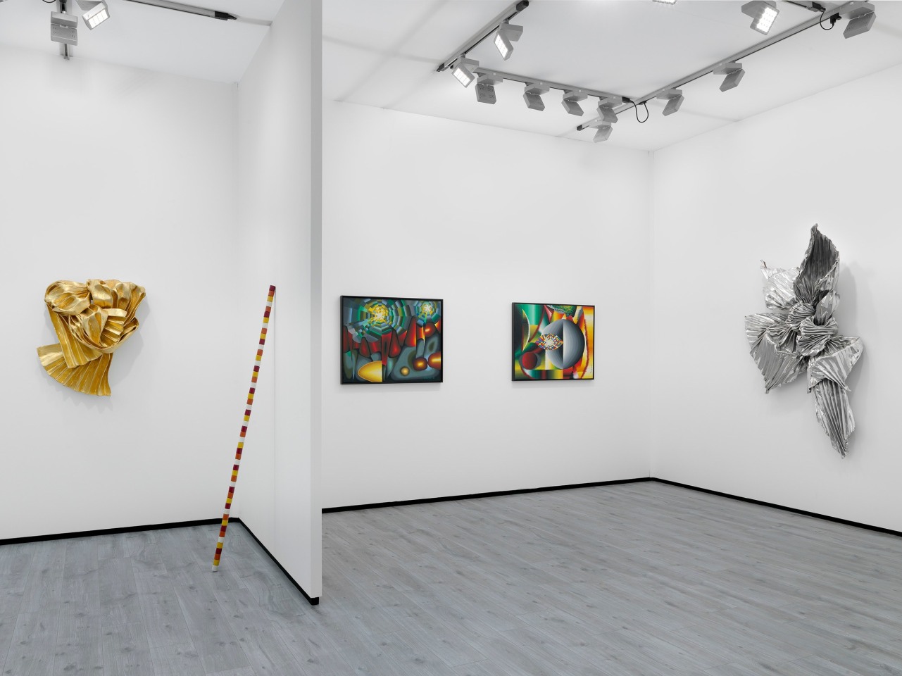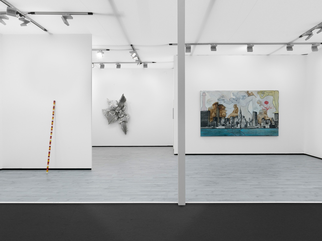 For Frieze Masters London 2021, Ortuzar Projects is pleased to announce a three-person presentation of works by Lynda Benglis, Andé Cadere, and Anita Steckel. Active in New York in the 1970s, each artist resisted prevailing notions of painting to create uniquely hybrid works in expanded form, across performance, new media, and sculpture. Courting controversy for her explicit critique of sexism in the history of figuration, Anita Steckel eventually incorporated photocopy, silkscreen, and montage into her graphite and oil compositions, melding fantasy and reality in works such as her monumental New York Skyline series (1970–80). A rare example of Cadere’s best known work, Round bar of wood B 01234000, is scaled to the artist’s own height, a portable double that is neither painting nor sculpture. The bar’s discrete quadrants of color rhyme with the structured, psychedelic abstractions he painted in Paris in the late-1960s. Benglis’s pleated wall-based sculptures were developed through a highly technical process of hand-folding wire mesh—afterwards sprayed with molten metal and selectively polished or delicately leafed in gold—manipulating the support itself into a baroque gesture suspended in space.