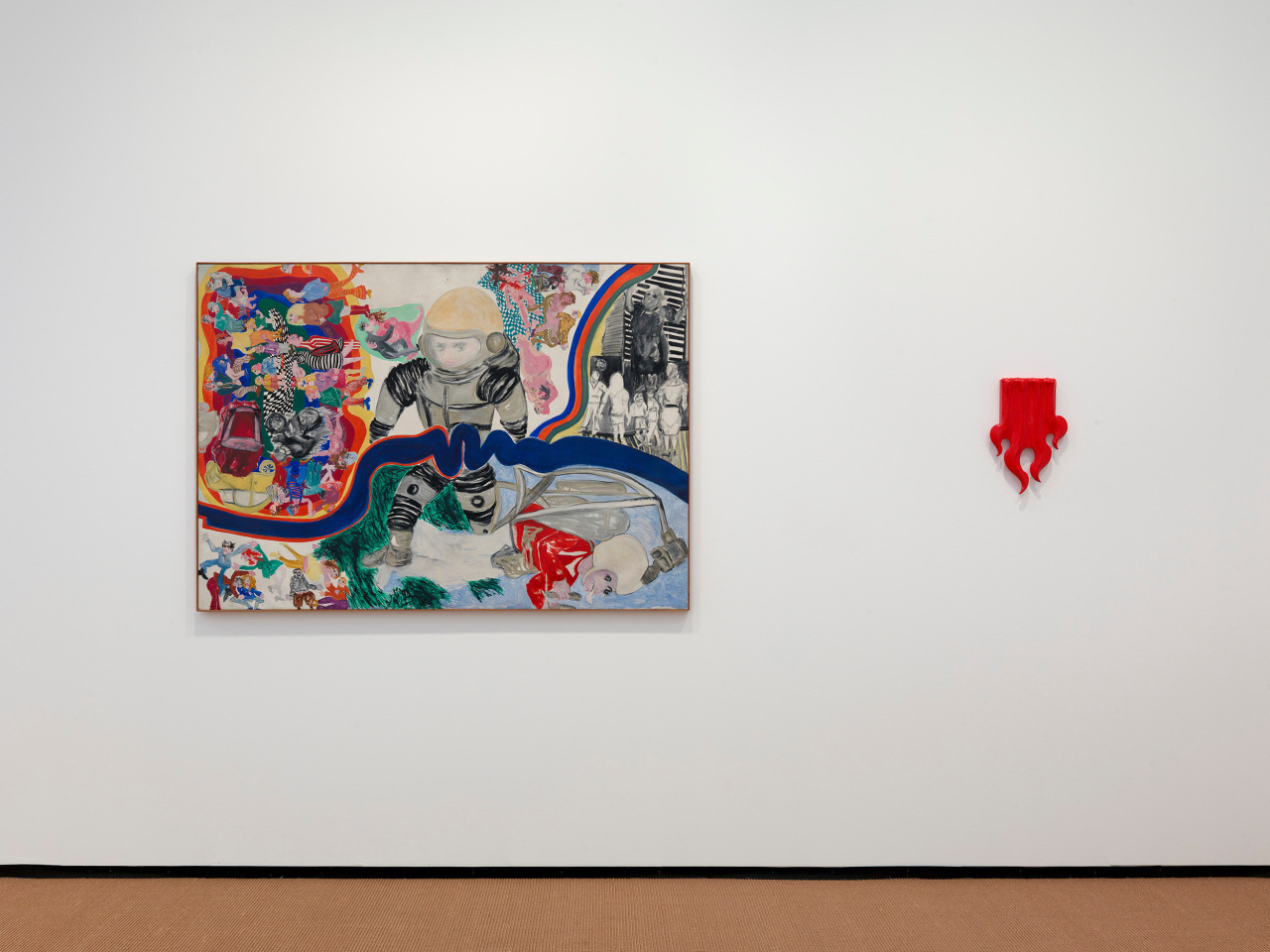 Ortuzar’s booth also includes a landmark work by Jacqueline de Jong from her “Vie privée de cosmonautes” (“Private Lives of Cosmonauts”) (1966–1967) series, in which the artist takes on the galactic perspective of an astronaut, surrounding the central figure with vibrantly colored vignettes from the 1960s cultural revolutions. A World War II émigrée, de Jong imbues her mini pictorial history with sensitivity to trauma and political powerlessness, while resisting fixed interpretation (or a fixed orientation; the painting can be hung in any way). The reclusive, mid-century artist Maybelle Stamper creates more enigmatic and internal visions on paper and board. Primarily a printmaker, the artist variously employs geometric abstraction, futurism, surrealism and symbolism through a proto-feminist lens. These works, many created during Stamper’s time on Captiva Island, express profound and deeply individual spiritual and psychological truths.