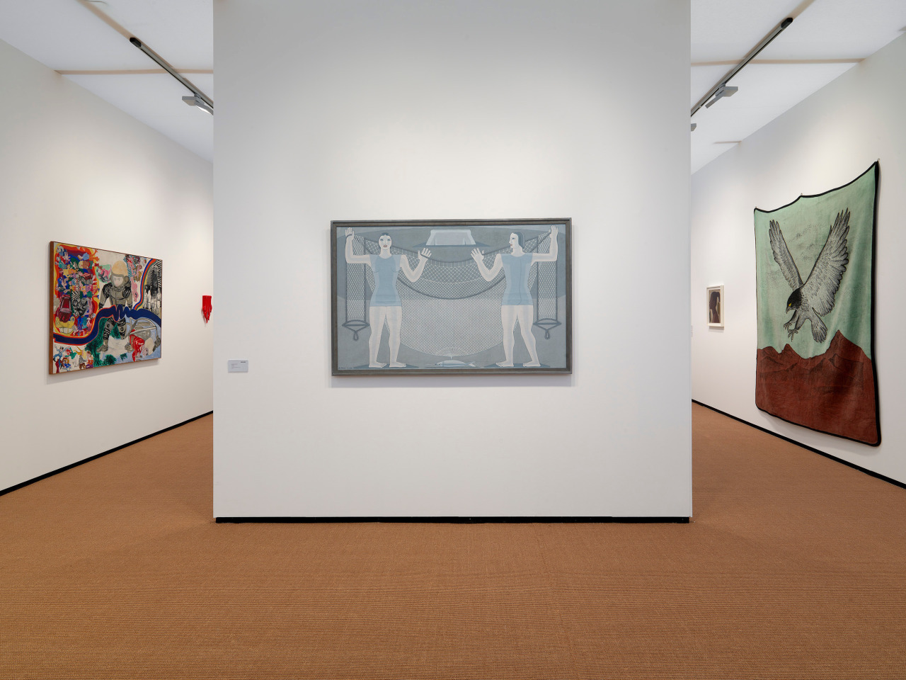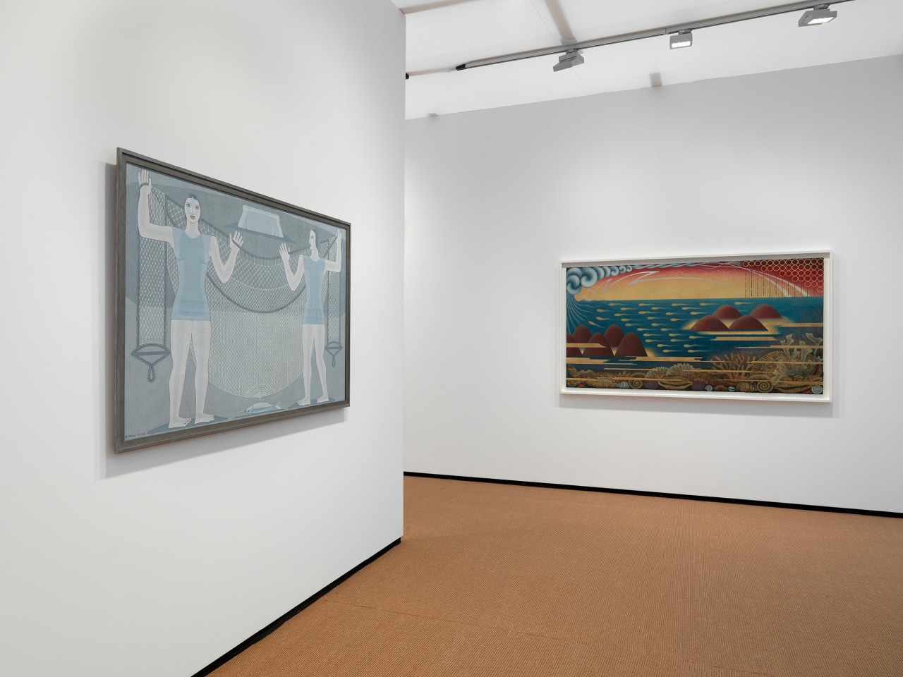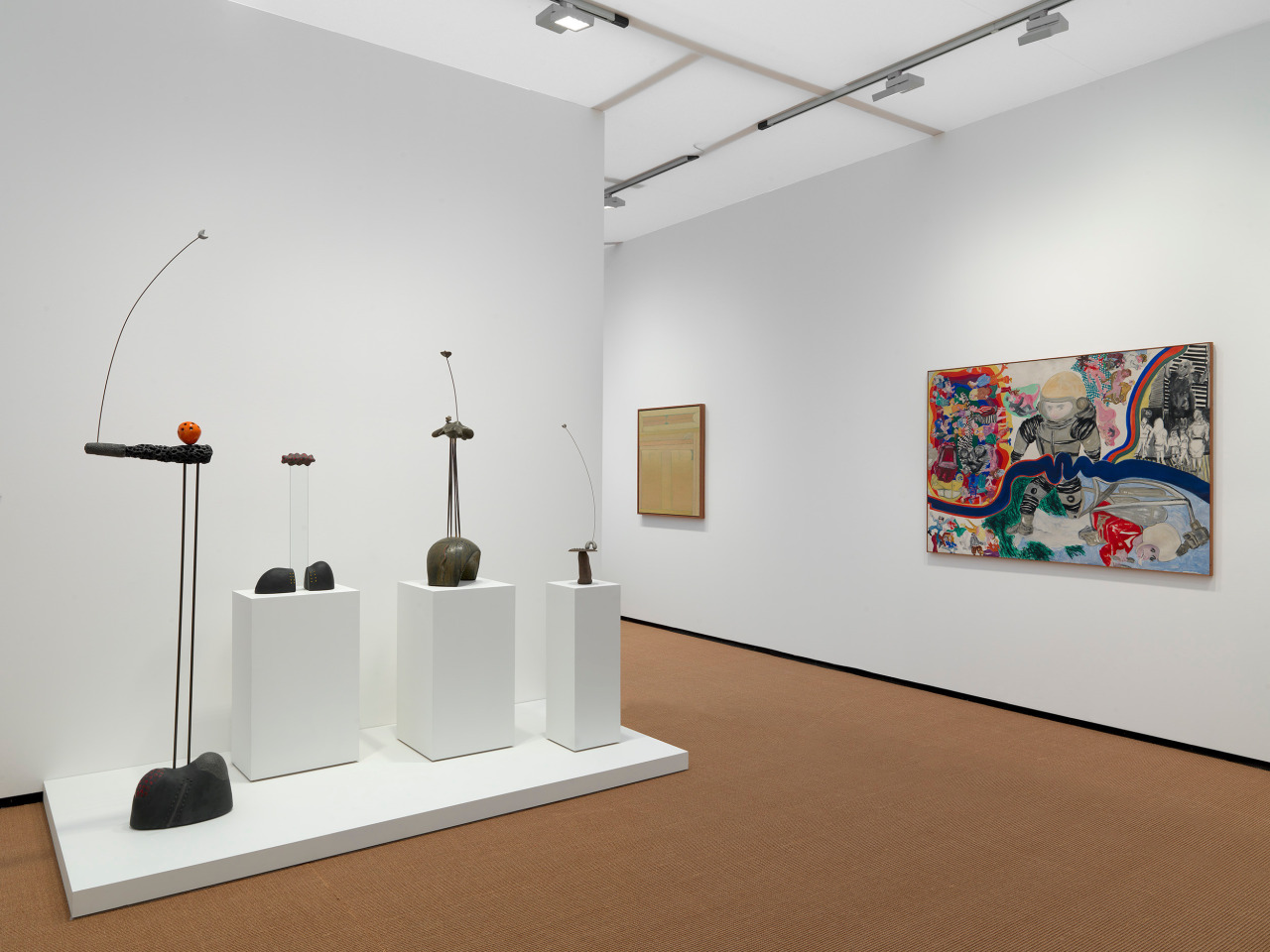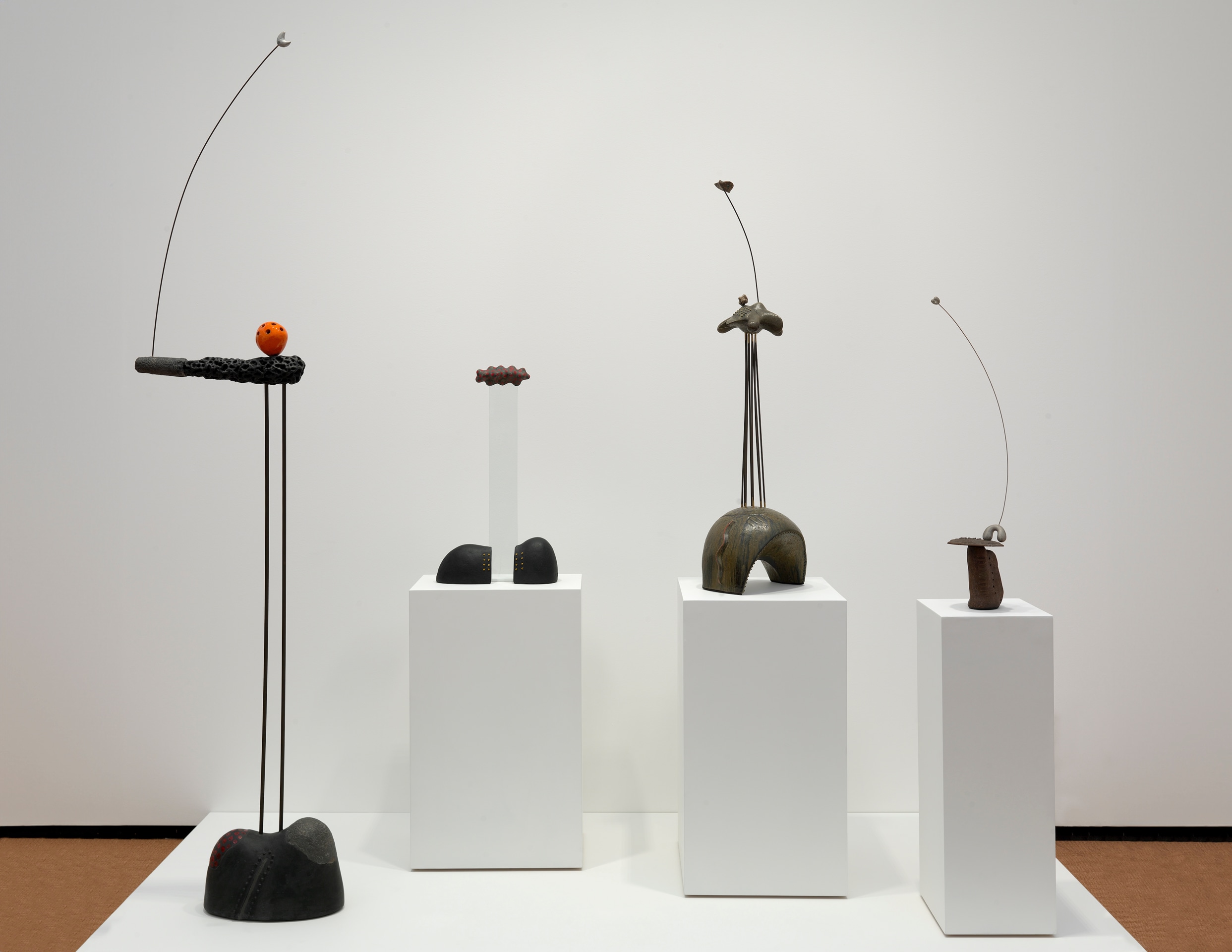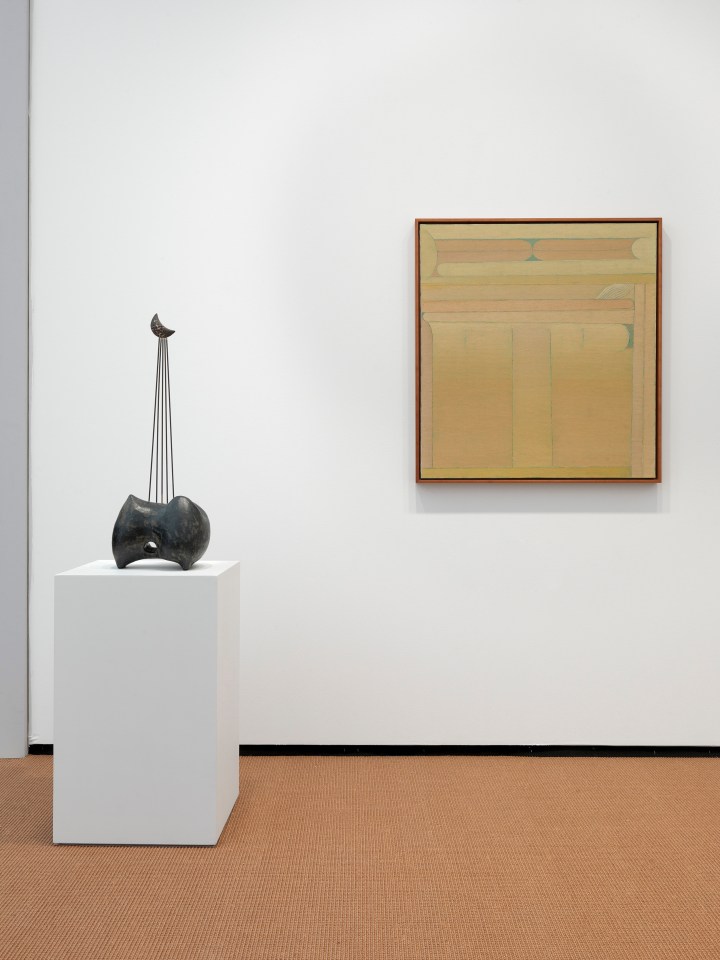 Megumi Yuasa, a Japanese-Brazilian sculptor and ceramicist, and Maruja Mallo, who relocated from Galicia, Spain to Buenos Aires, both combine their experiences of South America with their respective Japanese and Spanish heritage. In Yuasa’s work, including abstract sculptures from his “espássaros” series, the artist combines glazed ceramics, stone and metal to evoke cloudforms, mountains and trees. Miniaturized moons and biomorphic forms become universal symbols, suspended in space as if held in each other’s gravity. Mallo’s La Red (1938) from her “Religion of Work” series memorializes fishers and fieldworkers from coastal towns Bueu and Vigo in Galicia, depicting them as androgynous, mythological women. Mallo’s fascination with archetypes and scientific ordering systems also appears in her 1940s works, including Joven negra (1948), which regally depicts an Afro-Brazilian woman in profile.