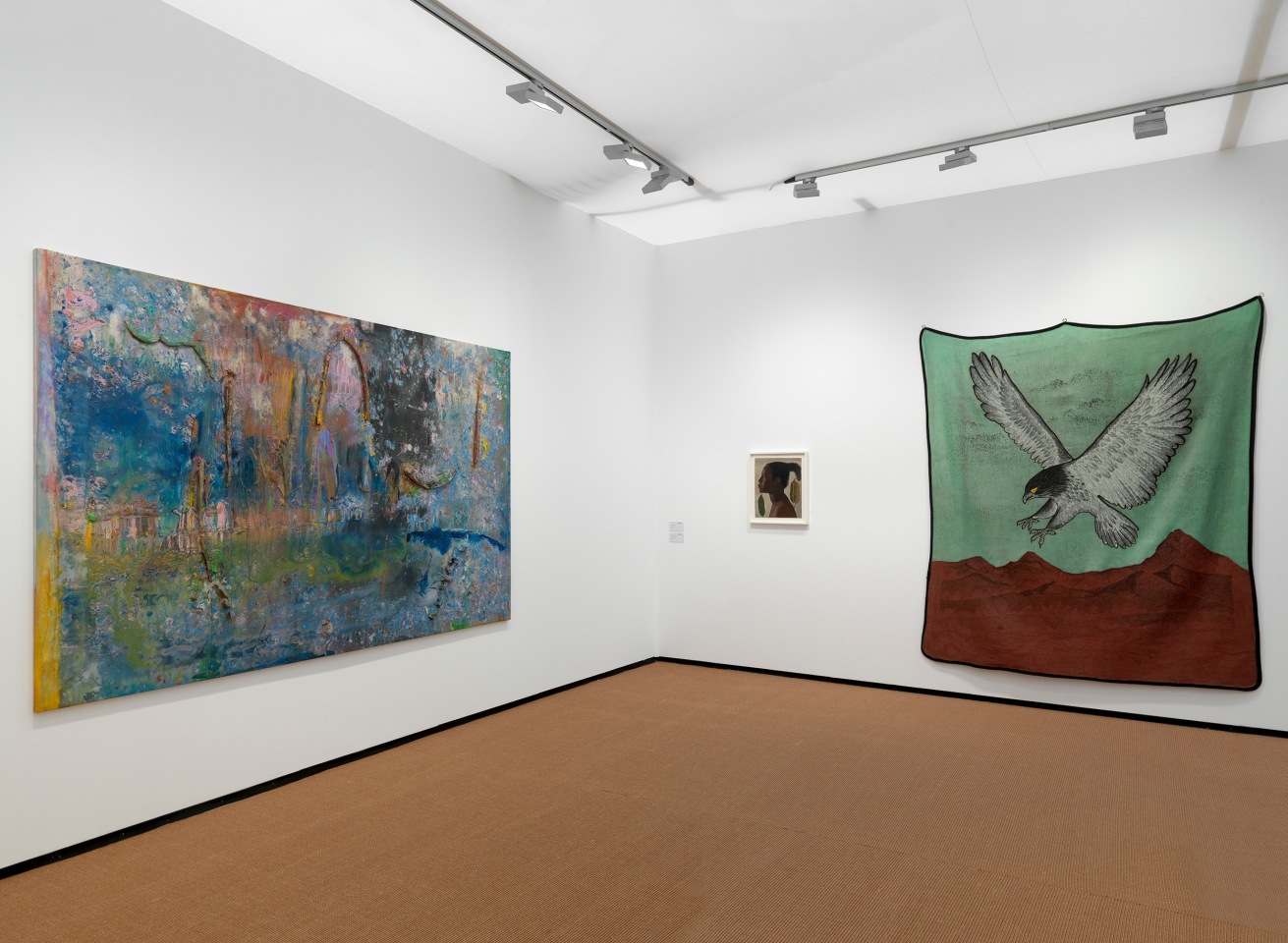 In many works on view, landscapes are rendered through abstract or stylized means, reflecting the artists’ biographies of migration and synthesis of multiple cultural frameworks. Frank Bowling’s monumental Towards Crab Island (1983) exemplifies this, referencing his native Guyana through heavily built-up surfaces that mimic the contours of landmasses emerging from the fluidity of the ocean. The title refers to an island in the Berbice River in Guyana, the first land one encounters when entering the harbor of New Amsterdam, where his mother was born, and attests to the powerful mnemonic echoes of Bowling’s homeland in his life and art.