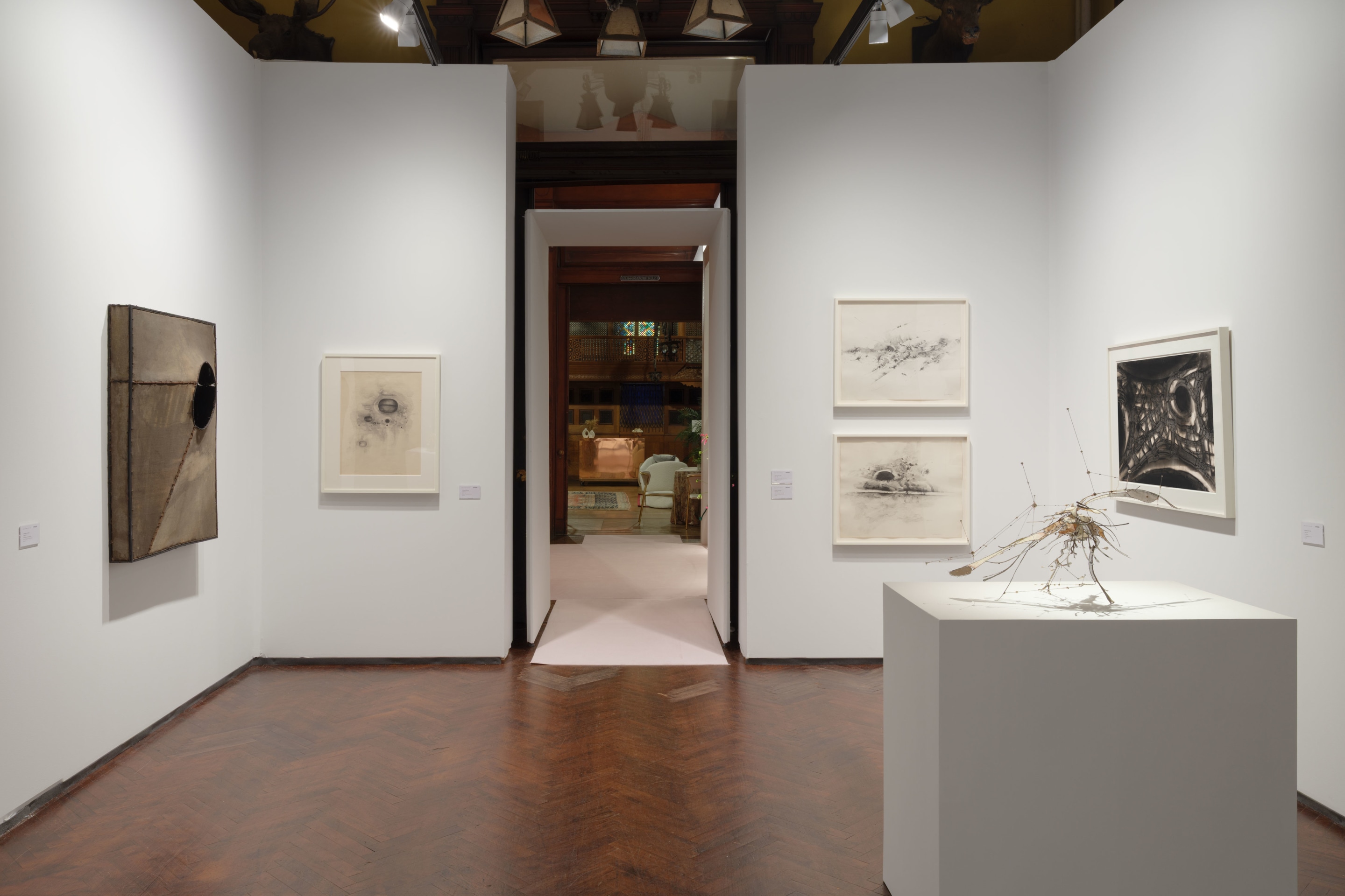 Early works on view further illuminate Bontecou’s longstanding engagement with materiality, space and structure. An untitled example from 1959, is also on view––one of her earliest explorations in this format. In these three-dimensional voids, the artist conjures metaphors for the sublime, fear and the infinite unknown. The 1959 wall relief exhibited here exemplifies these themes, with a deep central void framed by taut wires and sutured fabric, simulating both geological formations and cosmic phenomena.