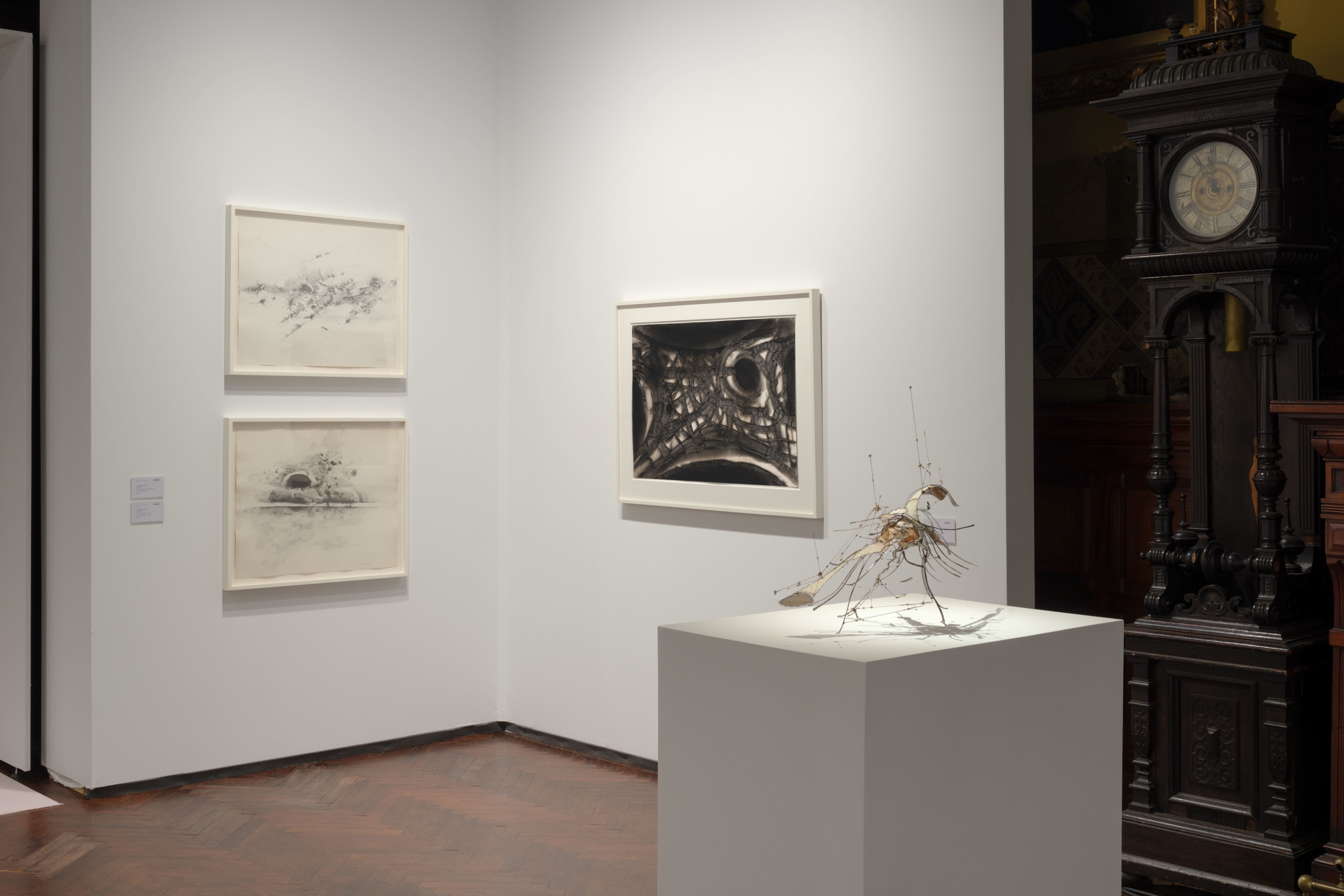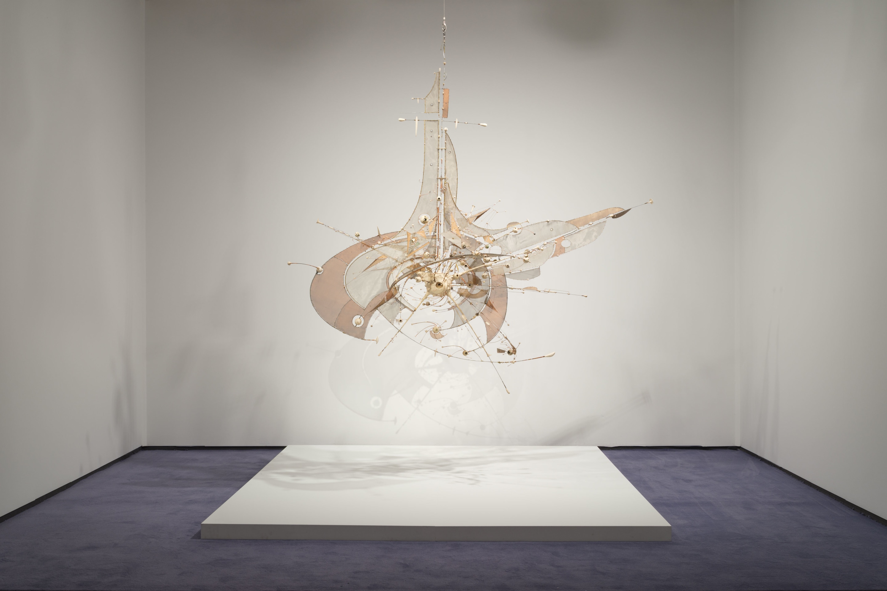 Throughout her career and across mediums, Bontecou visualized otherworldly landscapes through a complex spatial logic of protruding planes, radiating centers of gravity and ominous voids. In Untitled, she pushes these ideas further, transforming steel, wire and fabric into an intricate assemblage evocative of a solar system or sea creature. The suspended sculpture is over seven feet wide and comprised of metal armatures, translucent mesh and silk sails that radiate around porcelain orbs and plates. The work distills Bontecou’s long-standing preoccupations with outer space, industrial mechanics, quantum physics, war and marine life into a form that feels both manmade and resolutely alien. Its prolonged date range—from the 1980s to the early 2000s—reflects the artist’s time-consuming process of crafting each component by hand: welding metal frameworks, firing porcelain and stitching fabric. Also on view are related sculptural works in which the artist hones in on figurative forms that appear skeletal or insect-like, emphasizing the tension and delicacy within the artist’s formal language.
