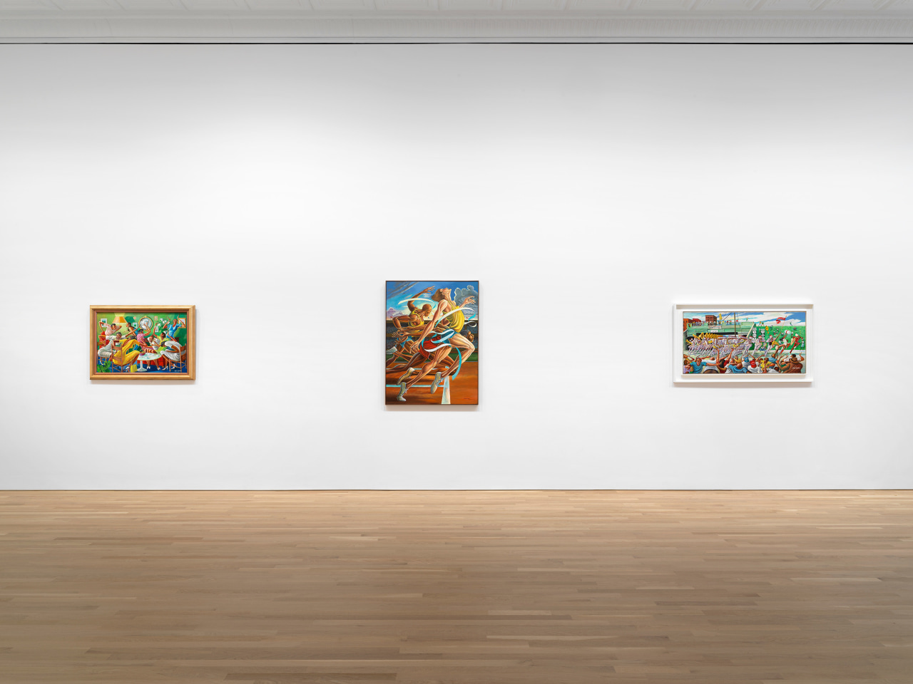 As an undergraduate, Barnes honed his skills in track and football while studying art under the direction of sculptor Ed Wilson, who helped him understand the significance of painting one’s immediate environment. In 1959 Barnes joined the American Football League (AFL) as a lineman for the Baltimore Colts before joining the Titans of New York in 1960 as an offensive guard. In turn, Barnes painted motion-heavy paintings reminiscent of Bellows’ depiction of boxers. Early ’60s paintings, such as We Love Our Team (1966), memorialize these early years, and later works like Fumble in the Line (1970) capture groups of elongated, sinuous players in motion. Barnes left the AFL in 1965 and became a full-time artist. With the support of New York Jets owner, Sonny Werblin, Barnes became the official artist of the AFL a year later and would continue to integrate sports into his painting throughout the ’70s and ’80s. Barnes painted a prolific series of basketball players, such as Protect the Rim (1976) and Slam Before the Storm (1979), which portrayed figures suspended in air to conjure a sense of transcendence in sport and teamwork. After years of painting scenes of football, basketball, polo, hockey, baseball, track and field, and more, Barnes would serve as the official artist of the 1984 Summer Olympic Games in Los Angeles.