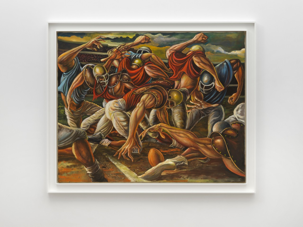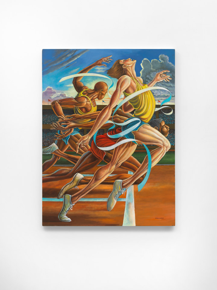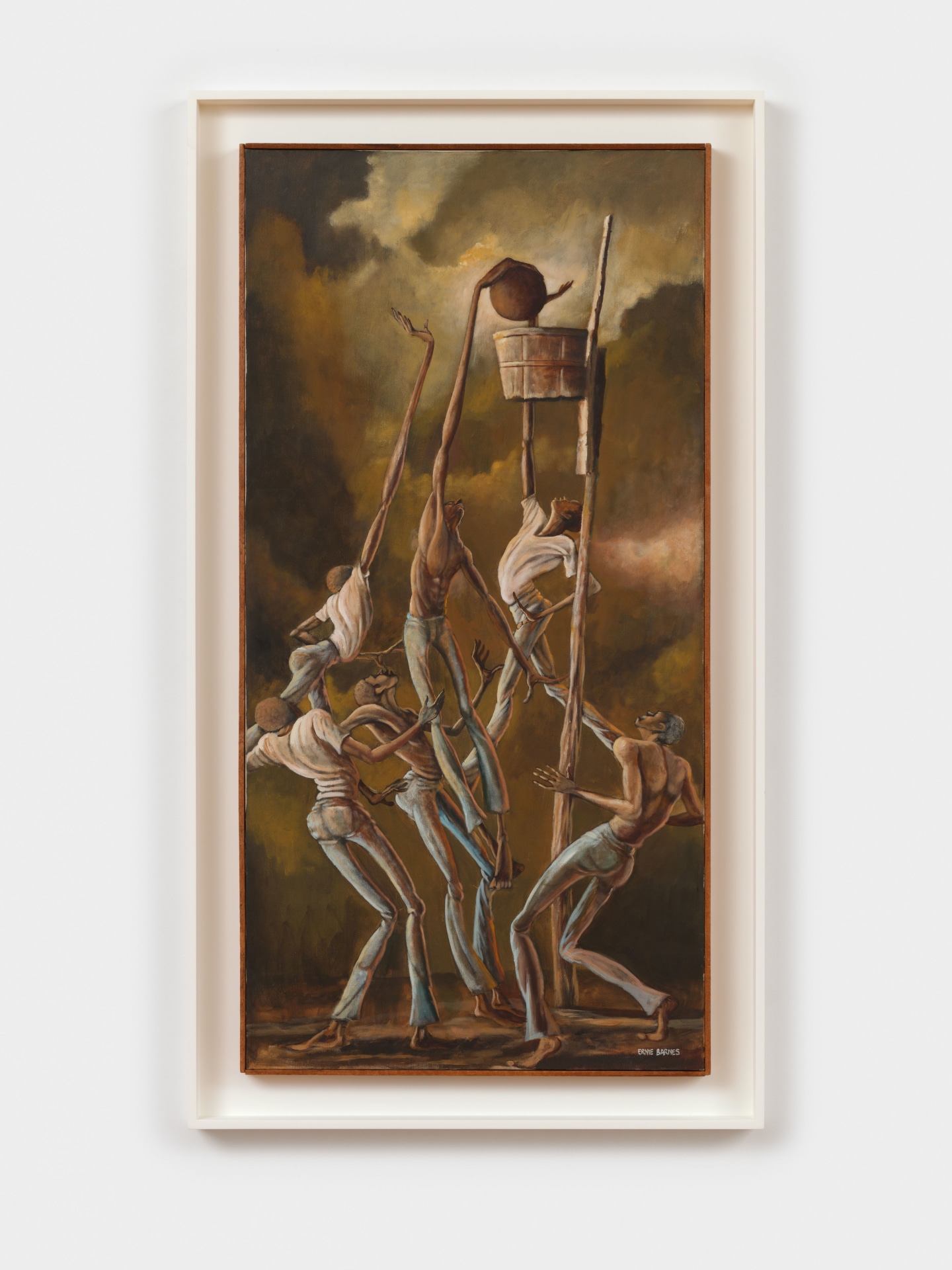 In his paintings, Barnes animates the lyricism of the human body in moments of athleticism and play. Barnes’ sinuous figures were inspired by both the Italian Mannerists and twentieth-century American masters, such as Thomas Hart Benton, Andrew Wyeth, Norman Rockwell, George Bellows and Charles White. Born and raised in Durham, North Carolina, at the height of the Jim Crow era, Barnes’ interest in art was cultivated by his mother, the housekeeper for Durham attorney Frank L. Fuller, Jr. Though segregation barred him from visiting museums as a child, Barnes was able to read art books at Fuller’s home before studying painting at North Carolina Central University (formerly North Carolina College) on a full athletic scholarship.