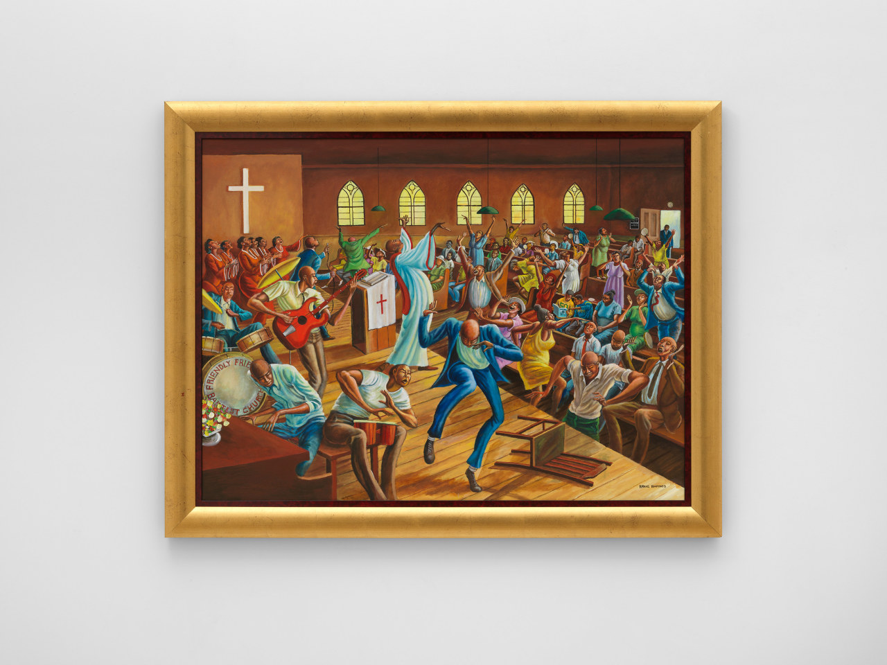 Throughout the ’70s, Barnes increasingly portrayed individuals and groups enraptured by song and dance. The passion captured in these depictions mirrors that in his sports and fanfare scenes. In his work, Barnes conveys moments of solitary pleasure as well as communal elation amongst families, crowds of fans, groups of friends and faith-based communities. Barnes’ ability to illustrate rhythm and movement inspired collaboration on album covers with musical artists, such as Marvin Gaye, Curtis Mayfield, and B.B. King, as well as music groups, such as The Crusaders and Faith, Hope, and Charity. A continuum of Black joy can be traced from Barnes’ earlier scenes of dance halls, such as Full Boogie (1978) to later paintings from the 1990s, such as Friendly Friendship Baptist Church (1994).