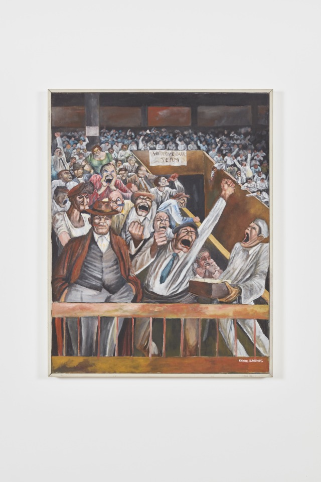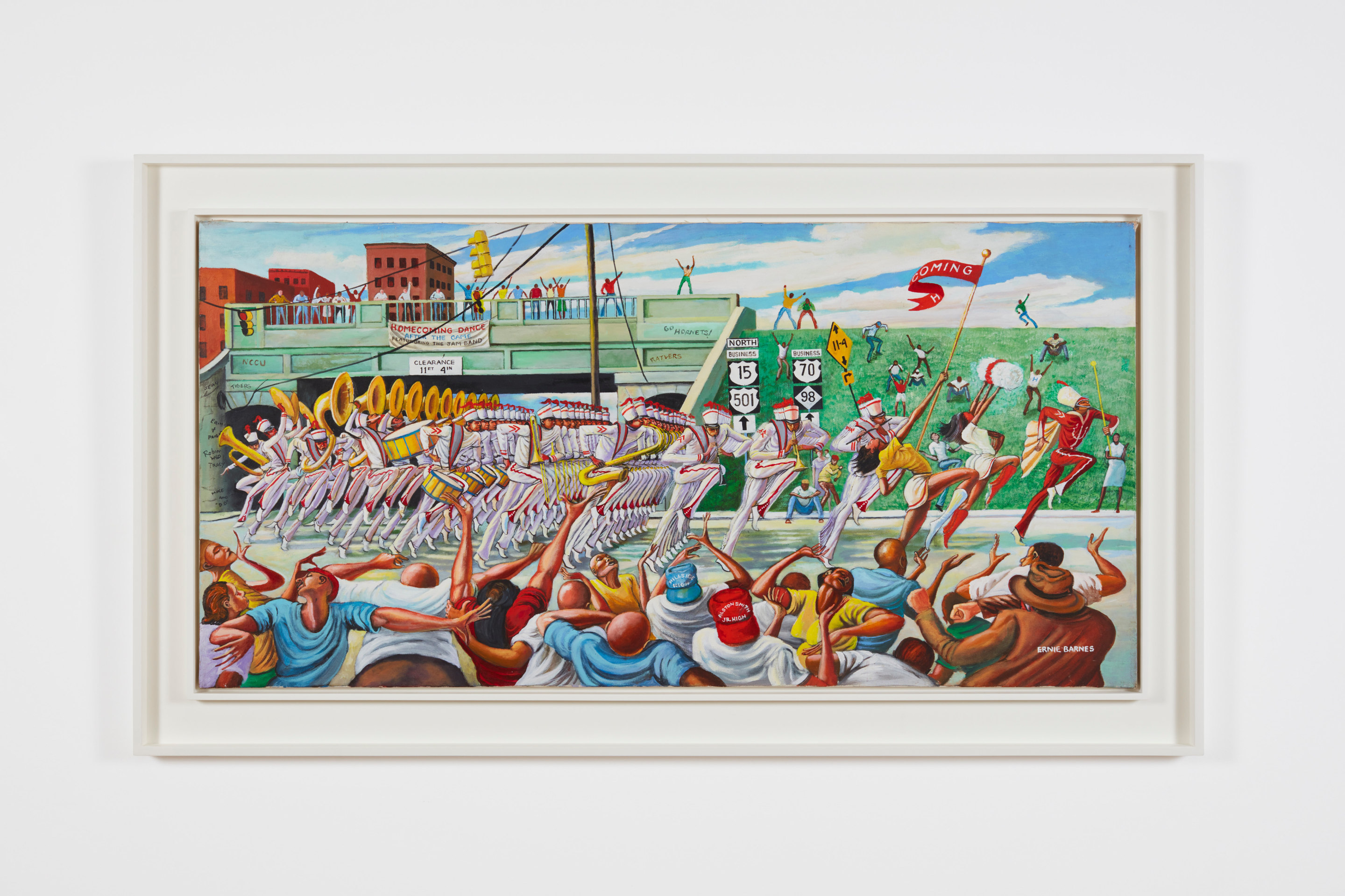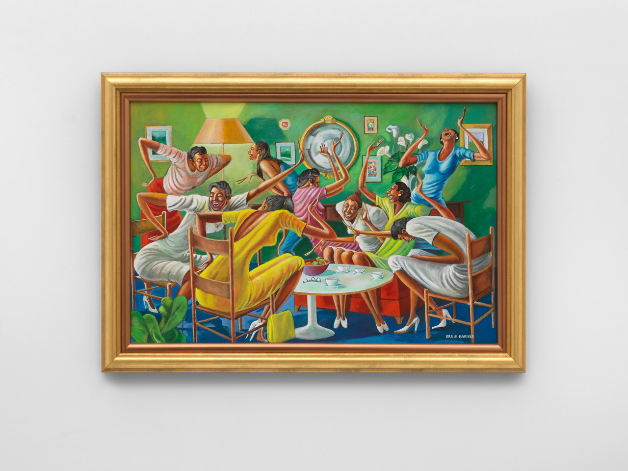 Recent solo exhibitions of Barnes’ work include Ernie Barnes: Where Music and Soul Live, UTA Artist Space, Los Angeles (2023); Ernie Barnes, Andrew Kreps Gallery, organized with Ortuzar Projects, New York (2021); Liberating Humanity from Within, UTA Artists Space, Los Angeles (2020); Ernie Barnes: A Retrospective, California African American Museum, Los Angeles (2019); and The North Carolina Roots of Artist Ernie Barnes, North Carolina Museum of History, Raleigh, North Carolina (2018-2019), among others. His work has been featured in institutional survey exhibitions including Giants: Art from the Dean Collection of Swiss Beatz and Alicia Keys, Brooklyn Museum, New York (2024); Dix and the Present, Deichtorhallen Hamburg, Hamburg, Germany (2023); Scrimmage: Football in American Art from The Civil War to The Present, Figge Museum of Art, Davenport, Iowa and Canton Museum of Art, Canton, Ohio (2017), Jordan Schnitzer Museum of Art, Eugene, Oregon (2016), University Art Museum at Colorado State University, Fort Collins, Colorado (2015); Visual Voice, Riverside Art Museum, Riverside, California (2016); I Got Rhythm: Art & Jazz Since 1920, Kunstmuseum Stuttgart, Stuttgart, Germany (2015). Barnes’ work is currently held in the permanent collections of the California African American Museum, Los Angeles; Pro Football Hall of Fame, Canton, Ohio; Brigham Young University Museum of Art, Provo, Utah; North Carolina Central University Art Museum, Durham, North Carolina; and the American Sport Art Museum and Archives, Daphne, Alabama, among others.