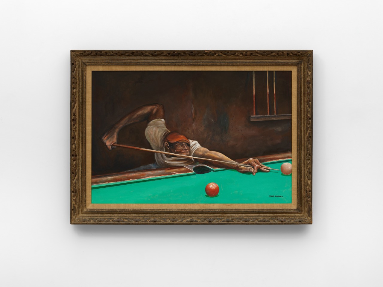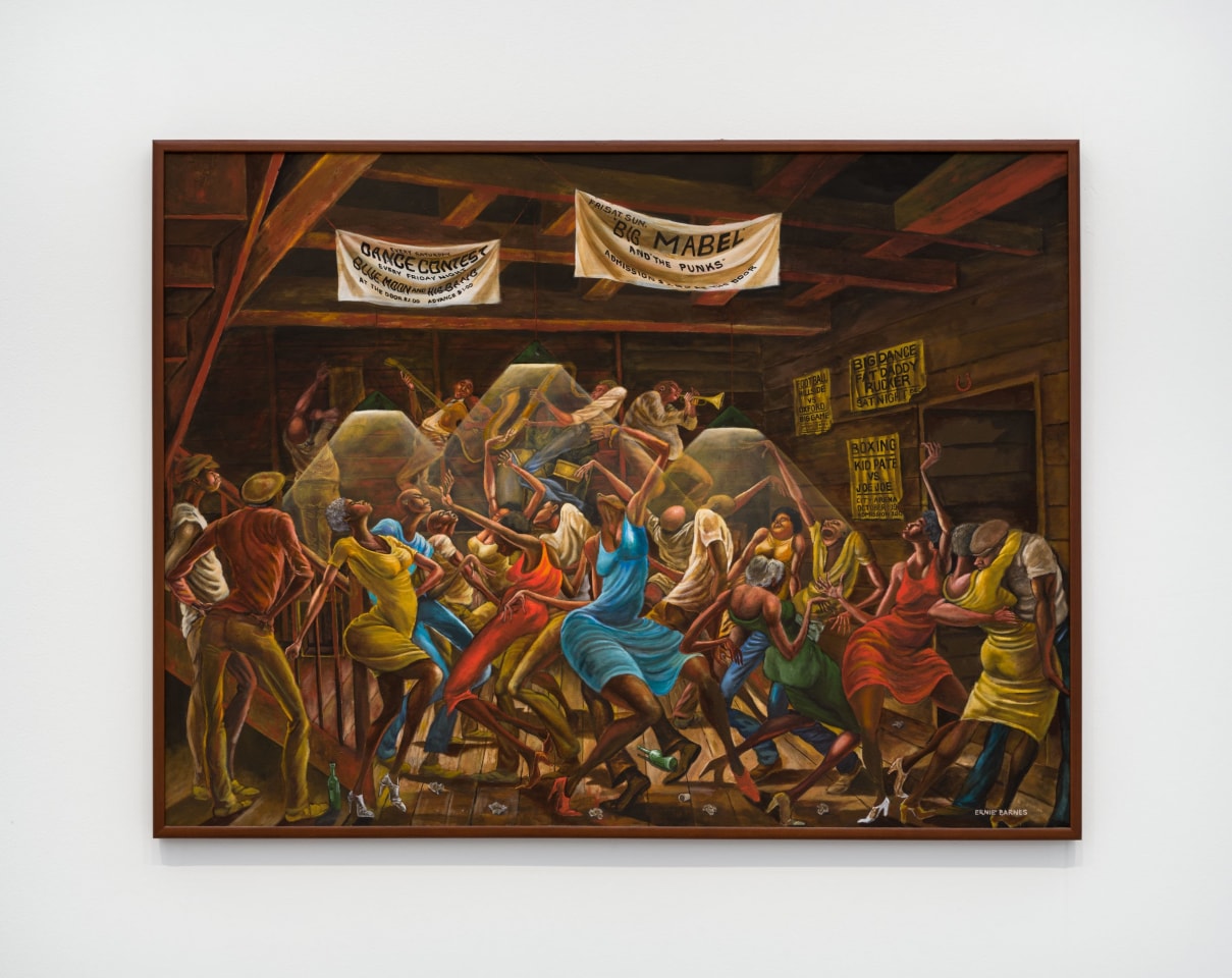Barnes’ iconic exhibition The Beauty of the Ghetto toured American cities from 1972 to 1979. In this show, his focus shifted away from sports and towards the beauty and joy of everyday life. His paintings of joyous figures and tender scenes of community redressed the dominant paradigm of Barnes’ era that framed Black art as “culturally blind” and showcased the virtuosity and vitality of mid-century Black southern life—what Barnes referred to as the “spiritual currency of the ghetto.” The painting Stickman (1971) depicts a Black pool player poised with his cue drawn back and eyes shut. In the following years, works like Juba Dis an Juba Dat (1976) would also touch on Black culture in the south, with references to Juba: the West African percussive dance adopted by slaves in the Antebellum South as a powerful form of musical resistance.