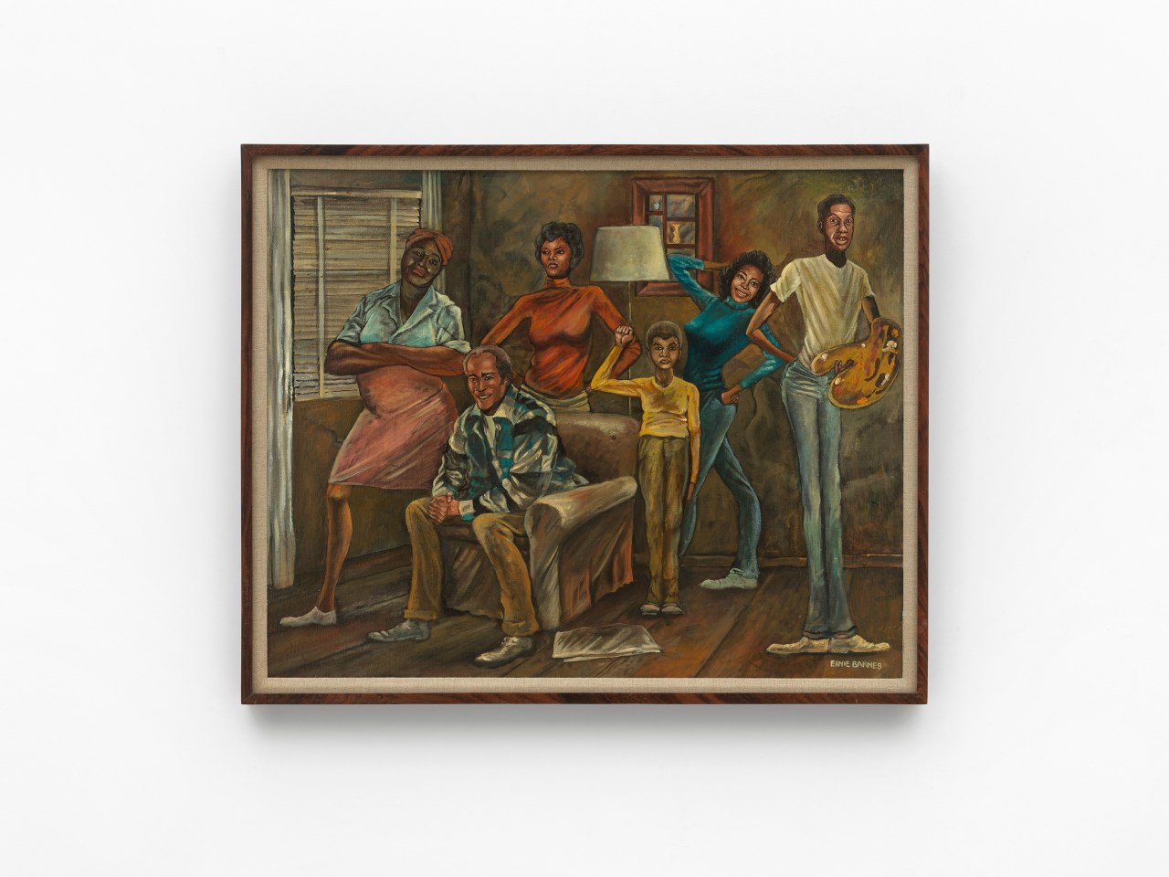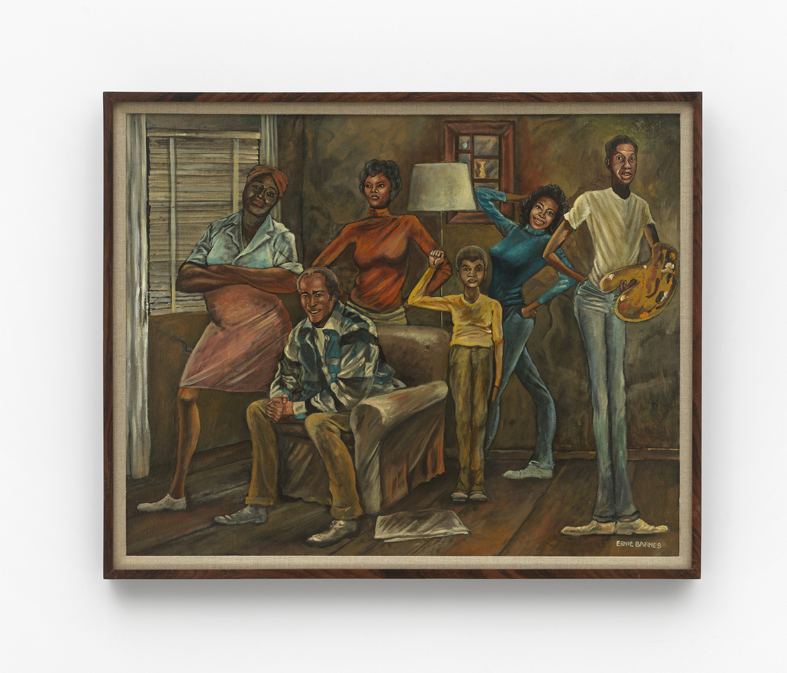 The circulation of Beauty of the Ghetto in the 1970s was pivotal to Barnes' career and marked the expansion of his work into popular culture. The show piqued the interest of Norman Lear, television producer and co-creator of the CBS sitcom Good Times (1974-1979) centered on a two-parent Black family living in a Chicago housing project. Actors Esther Rolle and John Amos starred as the parents of the fictional Evans Family, and the eldest son—an artist named JJ—was played by Jimmie Walker. Some of Barnes’ paintings from this traveling exhibition, such as Street Song (1971), featuring an acapella quartet harmonizing together with fingers snapping and hips swaying, became used as props in the sitcom as JJ’s own paintings. In Lear’s words, the “possibility of an artist lurking in everyone was a point I took special pleasure in when JJ’s talent as a painter unfolded.” Several of Barnes’ paintings were incorporated into the show during the run of Good Times, including some made specifically for the sitcom such as The Evans Family Portrait (1974) and Portrait of JJ (1974), as well as others from Barnes’ oeuvre, such as his famous painting The Sugar Shack (1976).