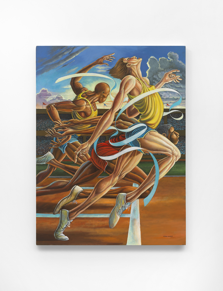 Ortuzar Projects is pleased to present “Ernie Barnes: In Rapture,” the gallery’s first exhibition of the late figurative painter Ernie Barnes (1938–2009) in collaboration with Andrew Kreps Gallery. Spanning five decades of Barnes’ career, this survey features genre paintings of sports, dance, musical performance and the joys of everyday life in his signature “neo-mannerist” style. Tracing the throughlines of elation and bodily movement throughout Barnes’ oeuvre, from early sports paintings to his mutual influence on popular culture, this exhibition pulls its title from the painting In Rapture on the cover of B.B. King’s 2000 album Making Love is Good for You.
