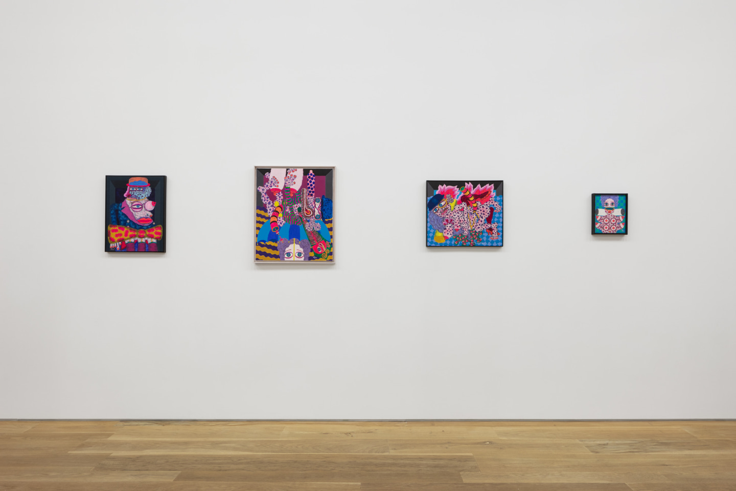 Arriving in Paris in 1965, Hiraga’s affinity for burai—a loose group of Japanese writers critical of the conventions of consumer society—soon descended into a delirious decadence, encouraged by the nightlife of the European capital and relaxed sexual mores. This transition is indicated by a decisive shift from calligraphic line to vibrant pattern and color. In temporally overloaded scenes a dissipated figure with purplish, speckled skin—a comic double for the artist, as in Untitled, 1967—strokes, grasps or else infiltrates supple breasts, voluptuously splayed limbs, and blooming orifices. Several canvases in this significant series, often titled The Elegant Life of Mr. K or The Elegant Life of Mr. H may also riff on the 1963 Yamaguchi Hitomi novel mocking the aspirations of 1960s Tokyo society, The Elegant Life of Mr. Everyman.