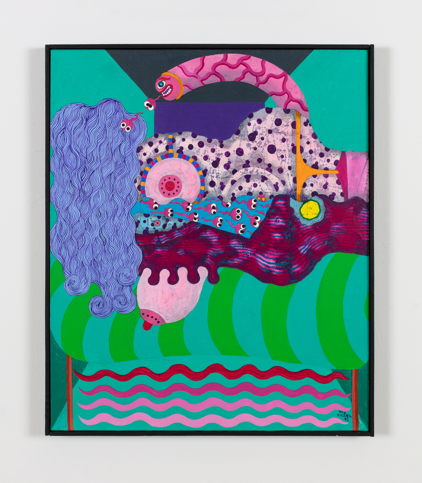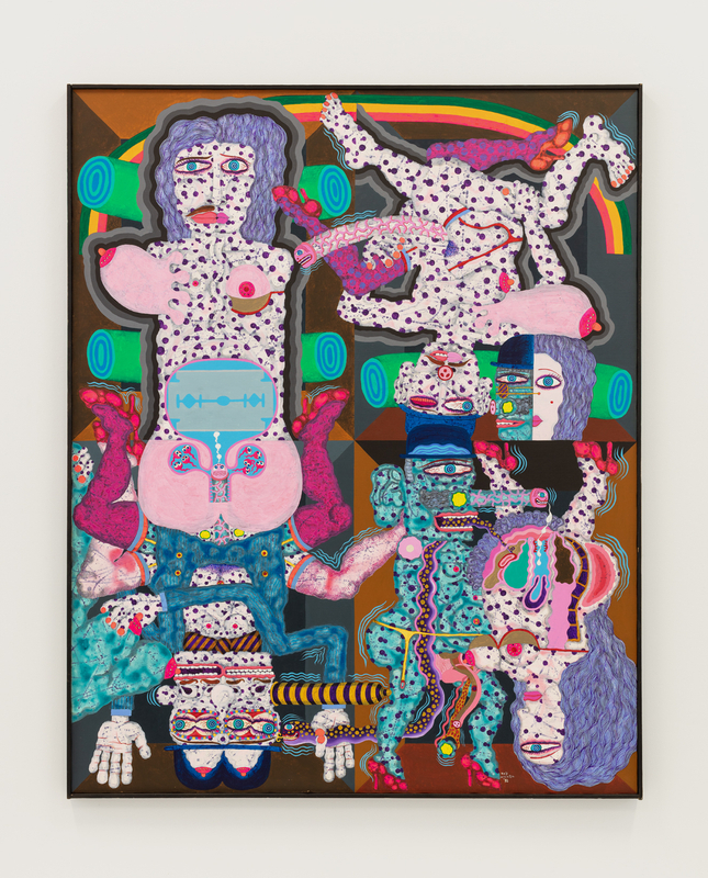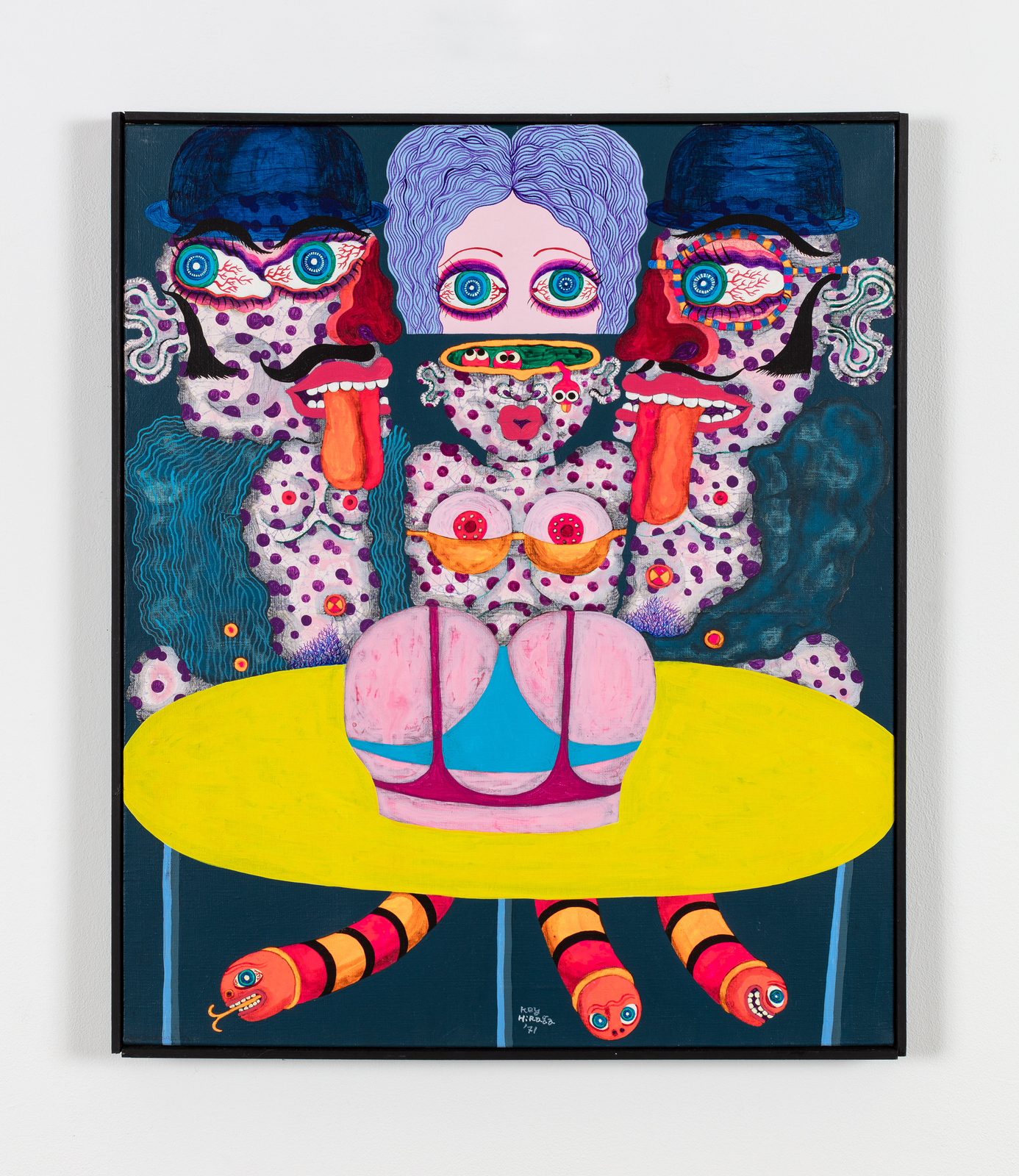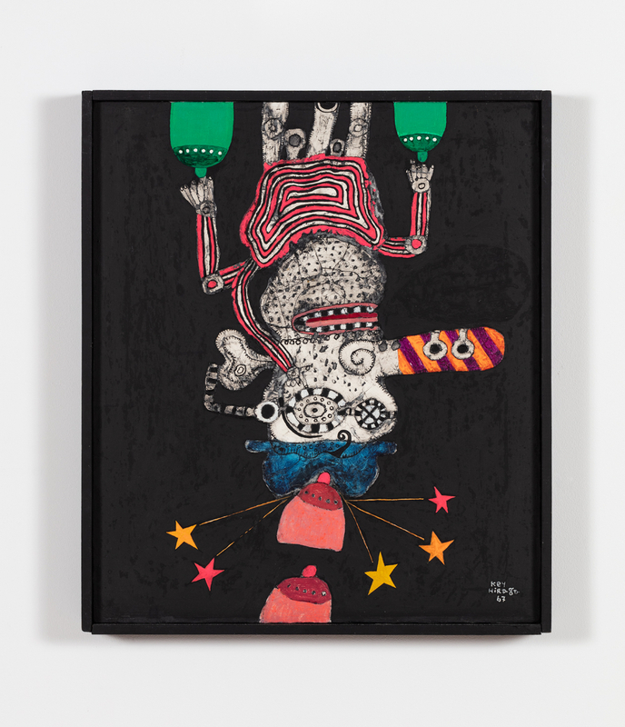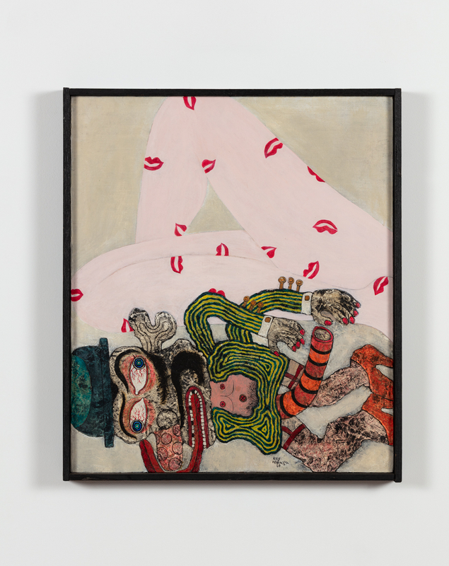Arriving in Paris in 1965, Hiraga’s affinity for burai—a loose group of Japanese writers critical of the conventions of consumer society—soon descended into a delirious decadence, encouraged by the nightlife of the European capital and relaxed sexual mores. This transition is indicated by a decisive shift from calligraphic line to vibrant pattern and color. In temporally overloaded scenes a dissipated figure with purplish, speckled skin—a comic double for the artist, as in Untitled (1967)—strokes, grasps or else infiltrates supple breasts, voluptuously splayed limbs, and blooming orifices. Several canvases in this significant series, often titled The Elegant Life of Mr. K or The Elegant Life of Mr. H may also riff on the 1963 Yamaguchi Hitomi novel mocking the aspirations of 1960s Tokyo society, The Elegant Life of Mr. Everyman.
