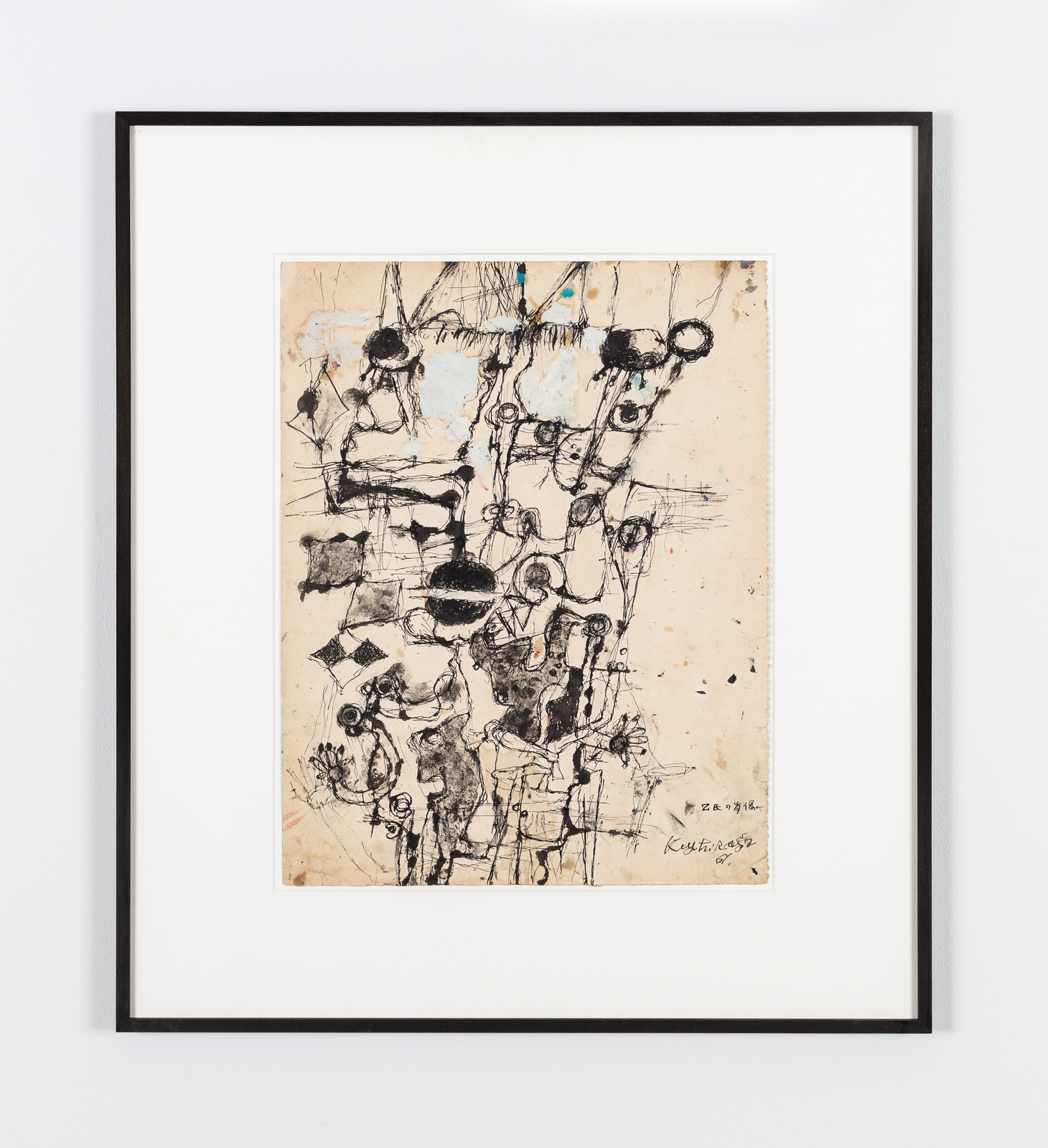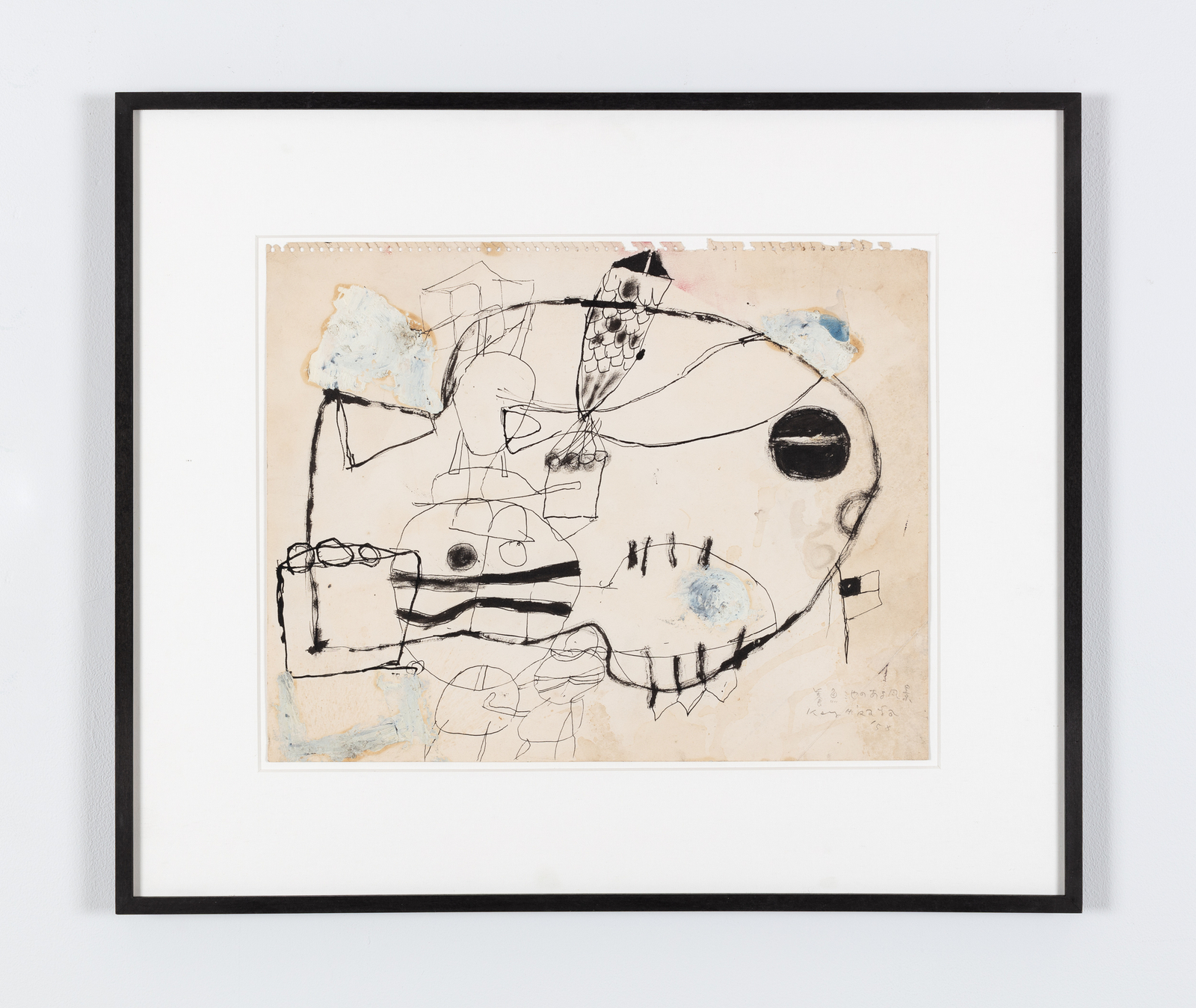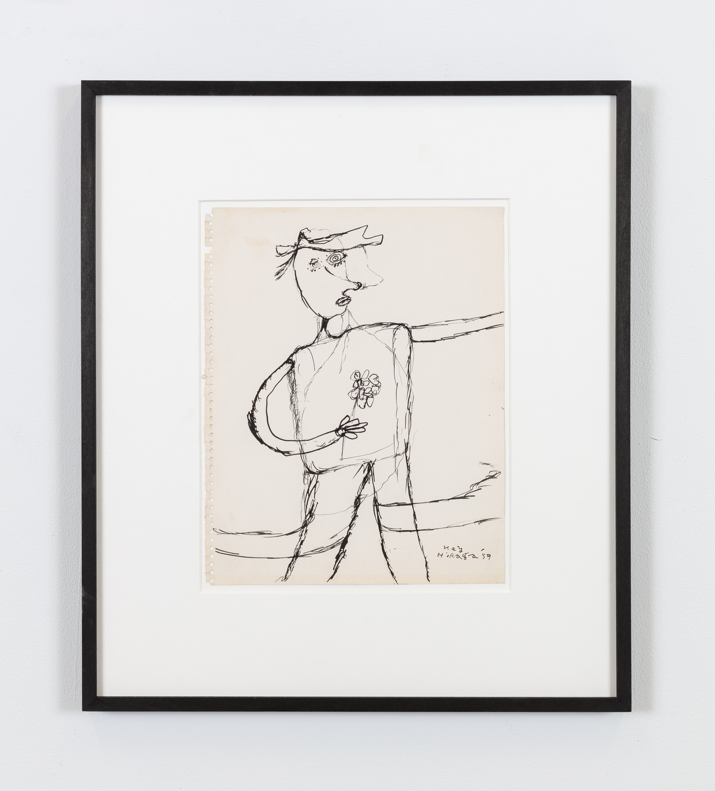 Raised in Morioka, north of Tokyo, Hiraga graduated from Rikkyo University in 1958 but was quickly drawn to a nascent artistic milieu that emerged during the social reorganization of postwar Japan. His works from this period experiment with line and color, tracing the anomie of contemporary urban life. Delicately executed in ink, these calligraphic outlines of abstract forms and intersecting figures have been compared to Dubuffet’s work. They anticipate the artist’s later canvases featuring emotionally entangled and ambiguously gendered characters.
