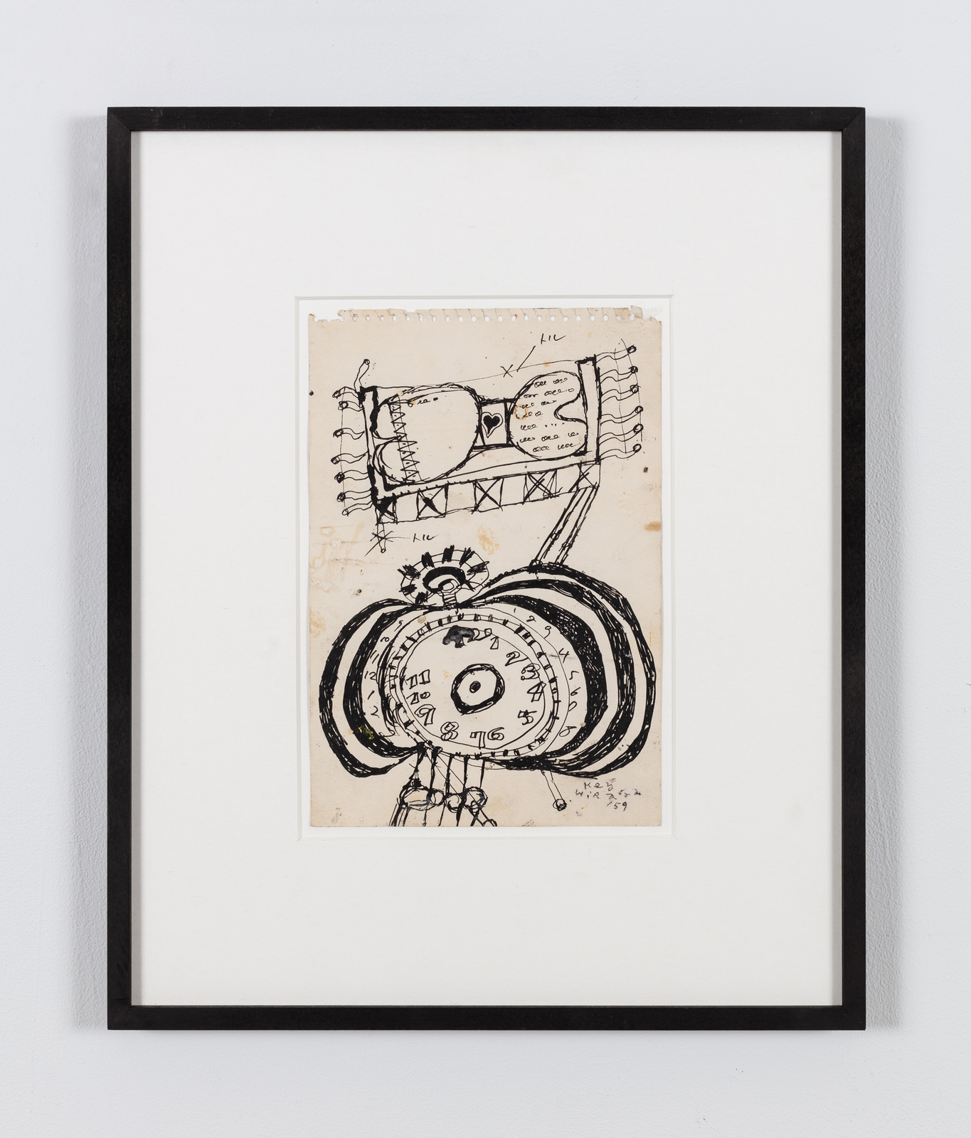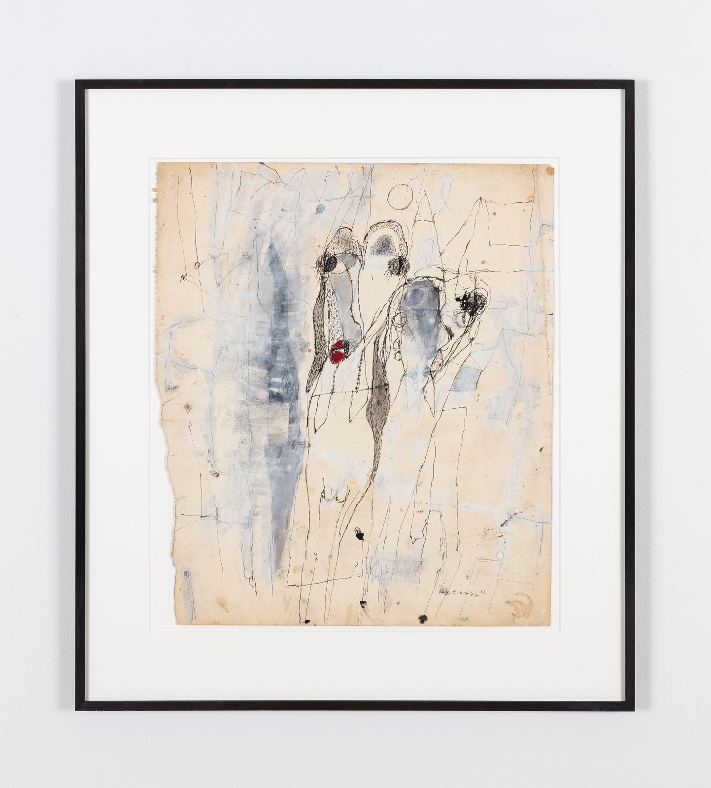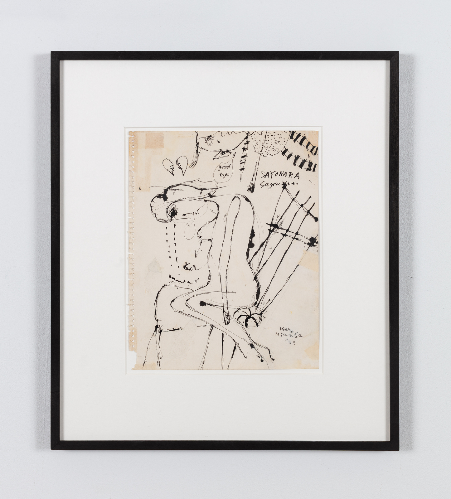 Raised in Morioka, north of Tokyo, Hiraga graduated from Rikkyo University in 1958 but was quickly drawn to a nascent artistic milieu that emerged during the social reorganization of postwar Japan. His works from this period experiment with line and color, tracing the anomie of contemporary urban life. Delicately executed in ink, these calligraphic outlines of abstract forms and intersecting figures have been compared to Dubuffet’s work. They anticipate the artist’s later canvases featuring emotionally entangled and ambiguously gendered characters.