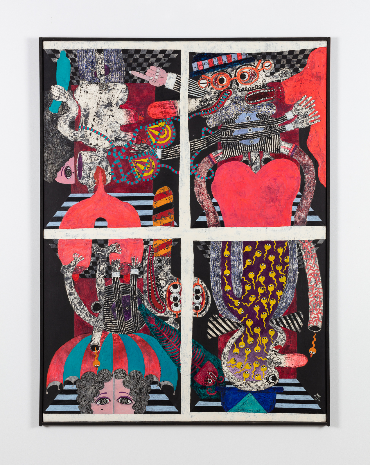 In 1964 Hiraga participated in several exhibitions for young artists and won a yearlong study grant in Paris. Two paintings were included in "The New Japanese Painting and Sculpture "(1965–1967) organized by the Museum of Modern Art, one of which was purchased for the museum’s collection. These works—reminiscent of Window (1968), on display here—juxtapose compartmentalized scenes, recalling a comic strip, and perhaps also the voyeuristic possibilities offered by the high-rise buildings sprouting up throughout Tokyo at the time.