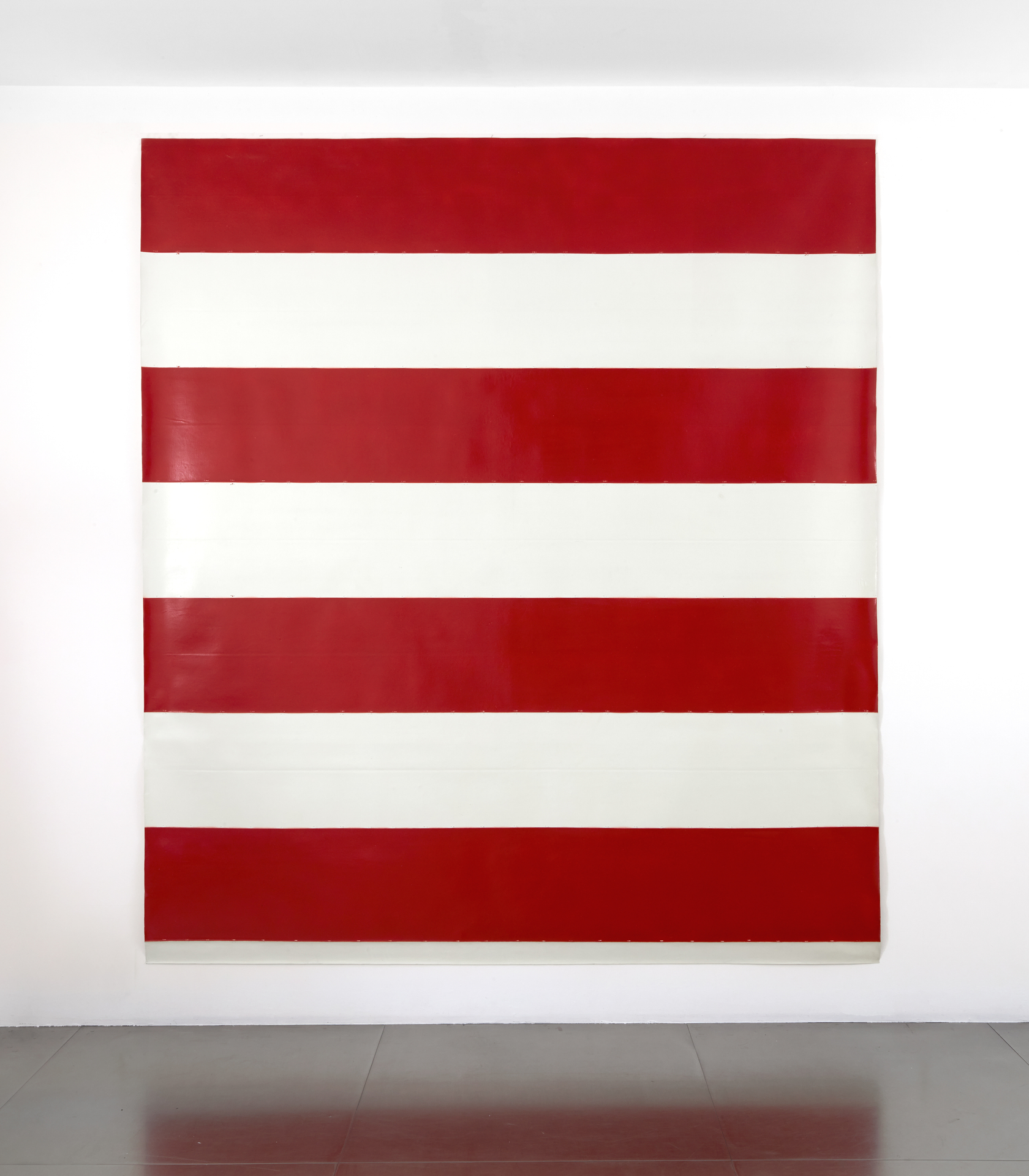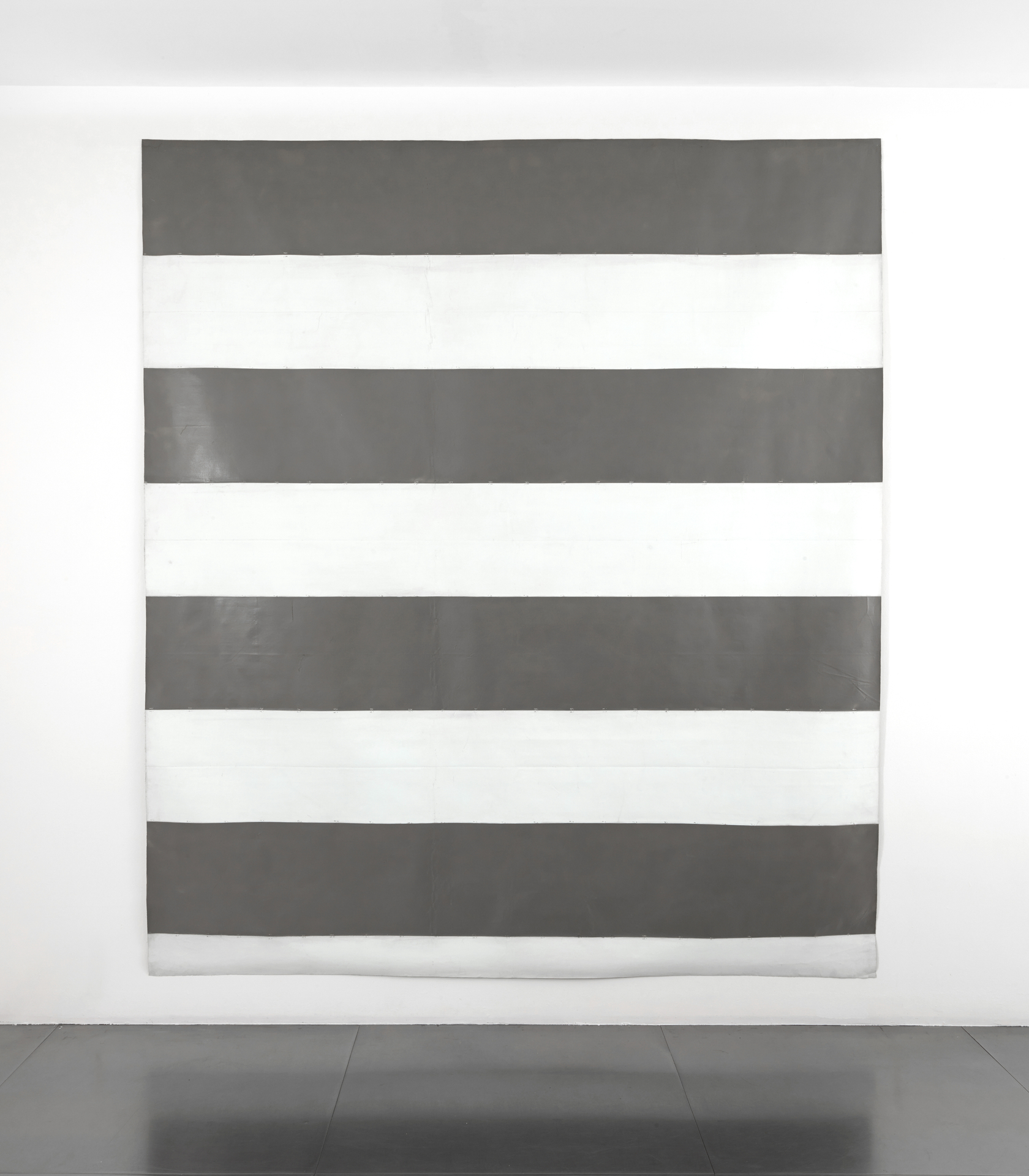 Grounding his practice on a denial of gesture and narrative, Michel Parmentier was an active and influential figure within the postwar critique on traditional modes of art-making. He is best known for the highly standardized, horizontally-striped canvases that he painted between 1965 and 1968. These works, produced through the pliage technique of folding the ground before the color is applied, are comprised of perfectly even, 38-centimeter band which Parmentier varied in color annually (blue in 1966, gray in 1967, red in 1968 and black after 1983).