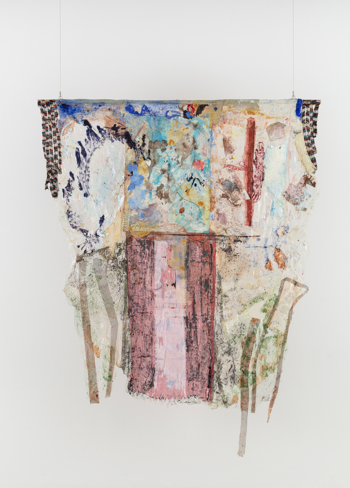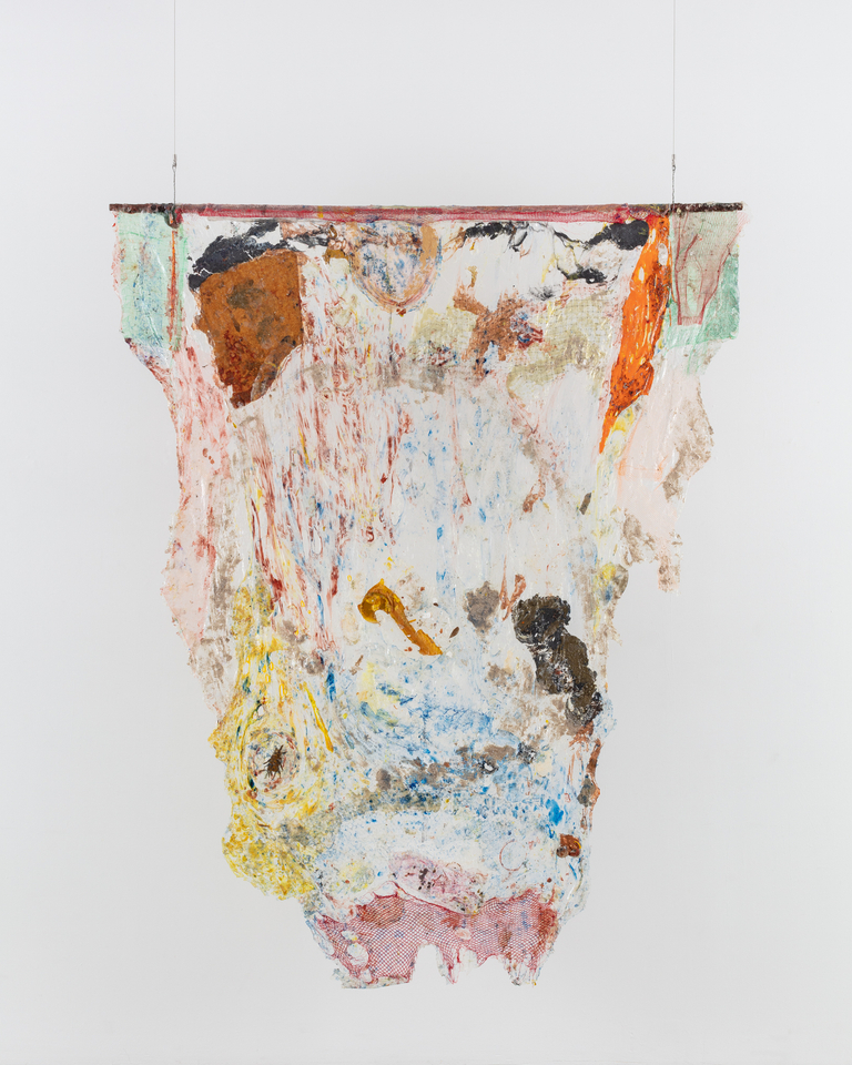 Built up in layers of pure acrylic, Jackson’s colossal “anti-canvases” are partially structured with netting, rods, and paper fragments, and strewn with cast-off color and other prosaic elements: peanut shells, bamboo, bells, loquat seeds, leather string. The artist’s handmade gestural impressions—pinching, crimping, and pleating—occur within a material transparency that lends each composition a uniquely lyrical and luminous dimensionality.