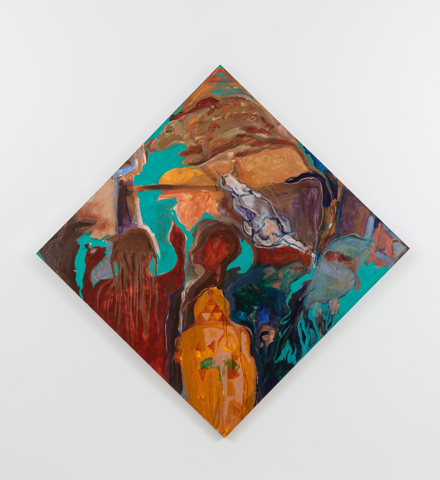 Jackson’s process further develops methods and techniques explored in acrylic washes in the early 1960s in a more figurative idiom. Her constellations of bodies, birds, botanical and marine life have since exploded the spatial constraints of the flat canvas to embrace the architectural scale of the gallery. Strongly rhythmic expressionist motifs recur across and reverberate through densely layered topological surfaces—as informed by balletic choreography and the drapery of the proscenium stage set as any history of Western painting. On Jackson’s aesthetic and intellectual independence, art historian Kellie Jones has remarked: “In the tradition of black migrant women before her, she . . . remade the West in her own image. It was a specter of freedom, evincing ‘female self-invention,’ . . . [and] a threat to the patriarchal order.”