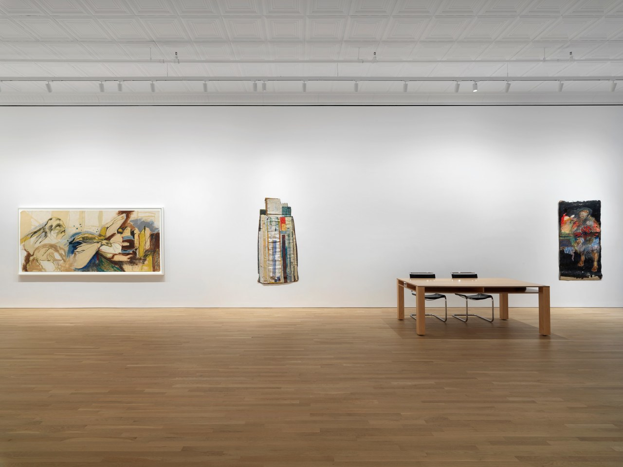 Vivian on East 14th Street (1994–1998) portrays a vagrant woman, and was made during a particularly itinerant and difficult period of Jackson’s life. Rendered in a distinctly gestural, angst-ridden style, the figure’s face emerges from a field of black, marked by ripples and tears in the paper and the texture of the burlap on which it is mounted. Just as paper freed Jackson from the rectangularity and flatness of the stretched canvas, it also liberated the work from frontality. As early as 2003––with 9, Billie, Mingus, Monk’s––Jackson began making double-sided works, continuing her persistent interest in the Gemini trait of duality, or the universal theme of oneness versus twoness. Composed of disparate materials both cheap and fine, the work is a wobbled and warped altar to three of Jazz’s greats (or, as she calls it, African American Classical Music). Like music, the work hangs in the air mid-breadth, its content and form inseparable amidst the innumerable painted and stained layers. The most recent work in the exhibition, Mr. Mink's Confusion 2000, 2008, 2024, dates to those three years, a testament to the open-ended and ongoing nature of Jackson’s practice. The remains of an earlier painting on paper––torn in half and reoriented in space––are embedded in clear acrylic gel medium alongside orange and red netting and globs of dried paint. The work floats above a sheet of transparent blue plexiglass, its shadow subsumed by the latter’s glaringly inorganic glow.