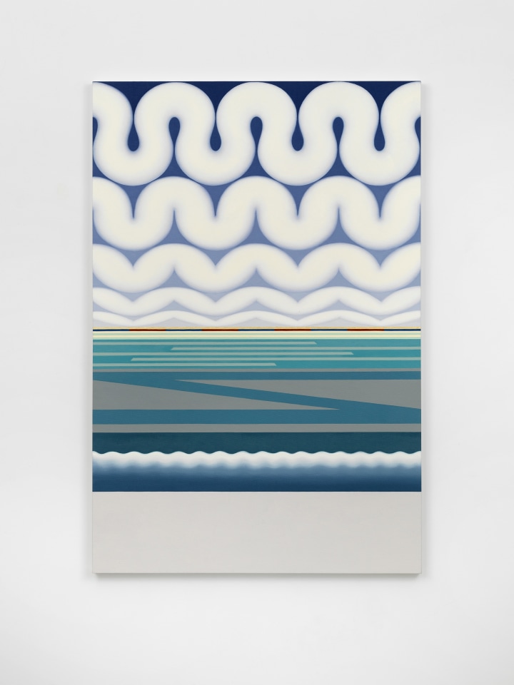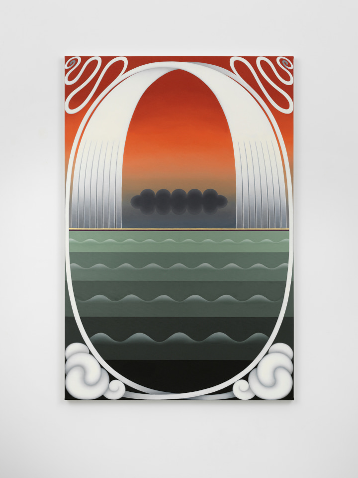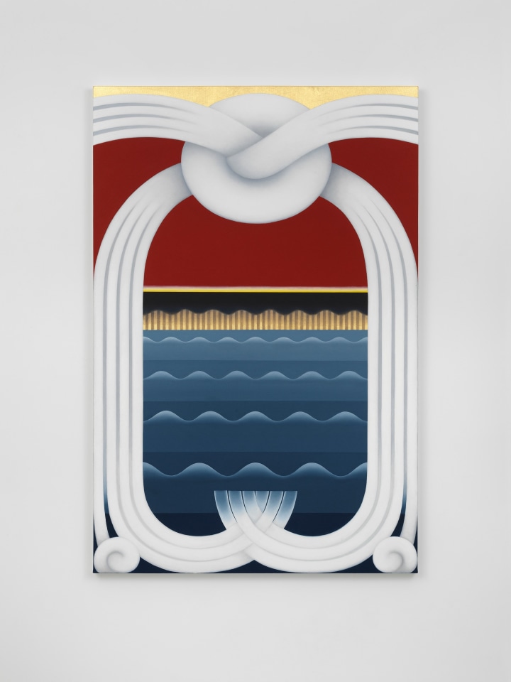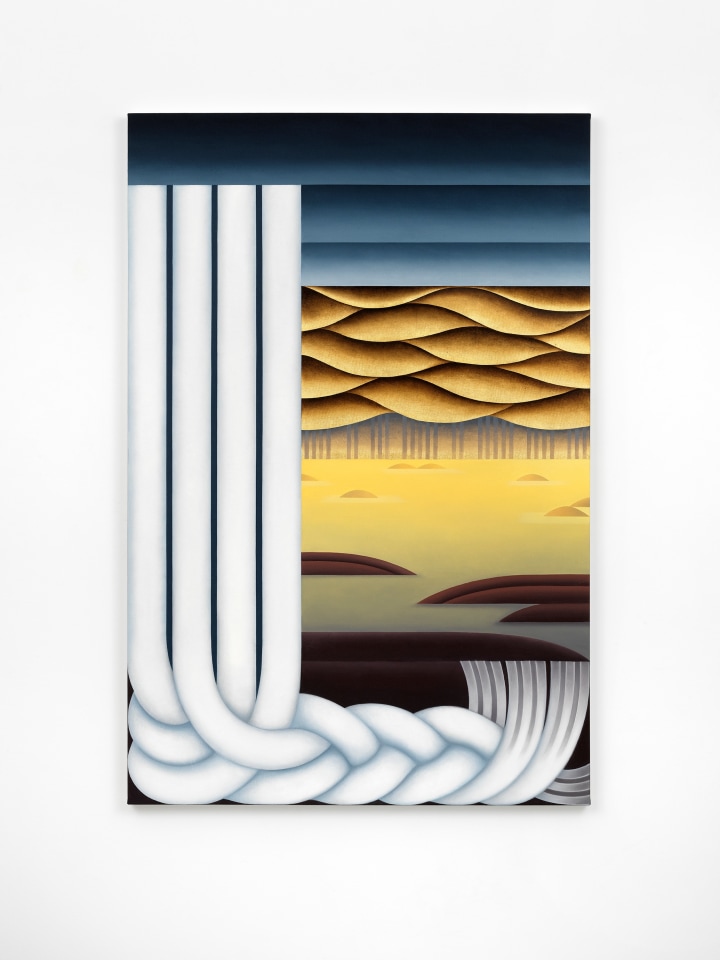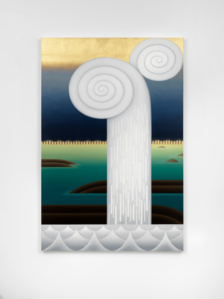 Yamaguchi’s ten seascapes, each sixty by forty inches, are rendered in oil and bronze leaf. Drawing on a diverse array of visual traditions from various parallel art histories, Yamaguchi has long sought to challenge the myth of an ostensibly race-neutral International Modernism through her work's elaboration upon it with aesthetics of local, national, and ethnic identity. Since the 1980s, Yamaguchi has produced focused series that interweave motifs pulled from Japanese screens and kimono textiles with figures or styles derived from Western art movements, including 19th-century Romanticism, Mexican Muralism, and Art Nouveau. In this new series, the artist’s uniquely syncretic approach destabilizes the conventions of both European and Japanese landscape traditions, and through their collision, creates a dialogue between aesthetic frameworks historically at odds.