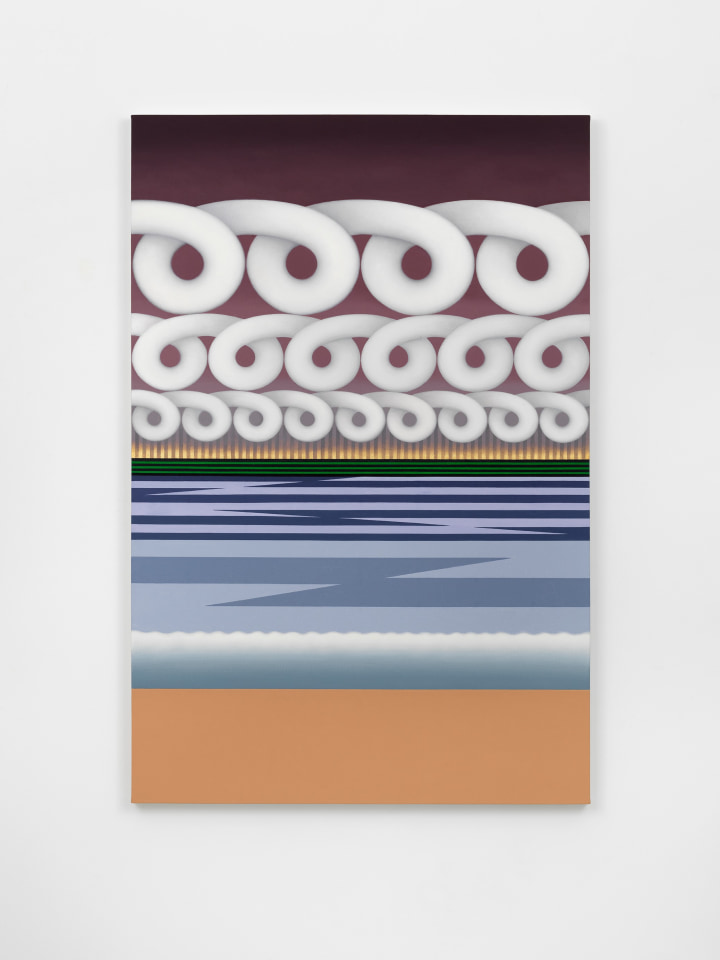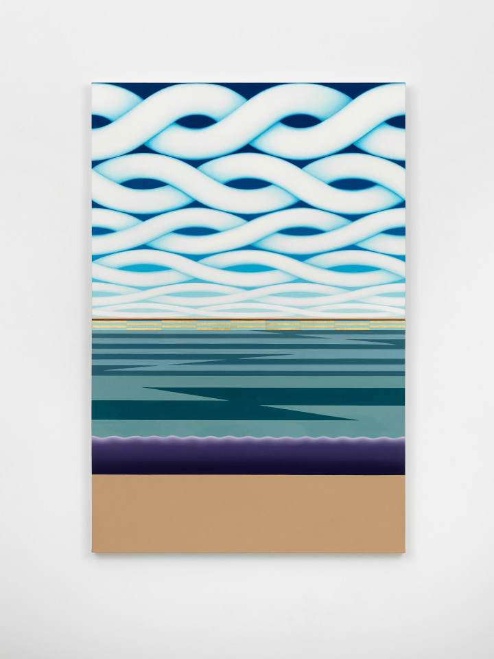 A uniform horizon divides each canvas in two, separating the oceanic from the atmospheric. Despite the stark geometry that bifurcates her uniform canvases, the continual movement of water, from waves to vapor to clouds to rain, and the shifting times of day, undoes the regularity of Yamaguchi’s serial works. The artist further creates subtle gradation that imbue her richly saturated paintings with an illusionism that is in stark contrast to the bronze leaf that sits as a reflective surface on the painting’s substrate. A glowing metallic sunrise is interrupted by clean lines of stark white rain; a heavy downpour braids itself into rivers, unfurling into rivulets like unwound thread; a teal and turquoise sea meets a monochrome bar of sand. Natural elements like clouds, waves, and mountainous islands are made into recurring symbols; repeating like scales of fish, zig-zagging, looping, or braiding together. Moving between near-naturalism and something more akin to hard-edged painting, the elements variably recede into the picture plane or sit on top of each other, obfuscating the infinite horizon behind them, framing it, letting the viewer in.